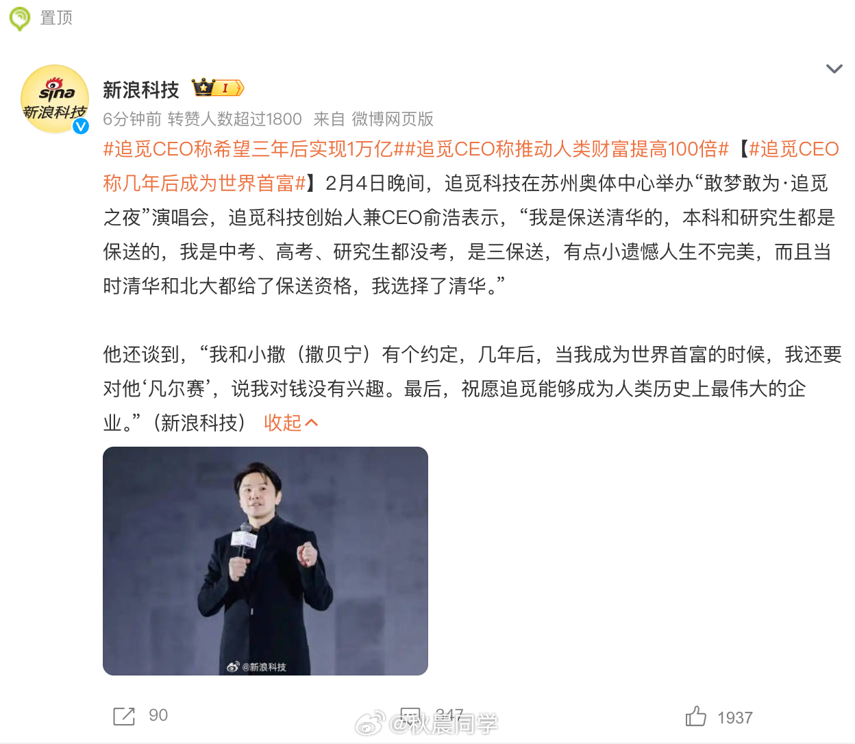 追觅CEO称几年后成为世界首富追觅CEO称希望三年后实现1万亿