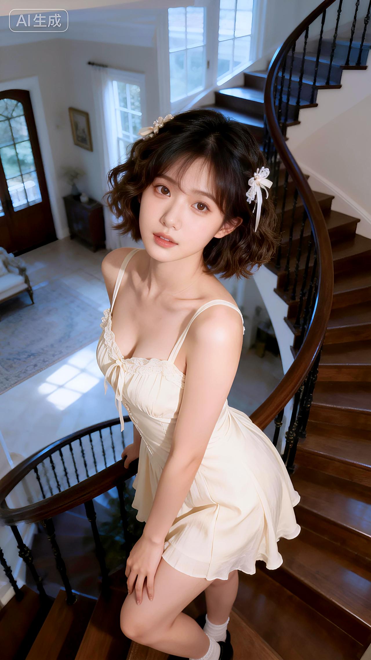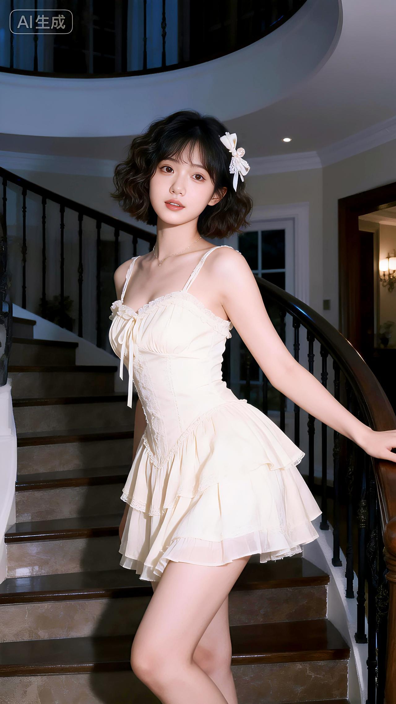旋梯漫步意从容,白色裙装映晴空。豆包 壁纸
