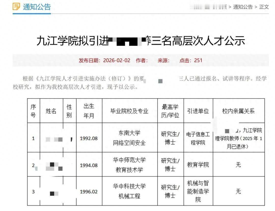 江西九江学院在引进人才时,主动公开亲属关系,大大方方坦坦荡荡,收获肯定和好评。 在九江学院最近公布的一则引进高层次人才时,对公示基本信息时,还加了一项“校内亲属关系”,列表第一位的,是一名毕业于东南大学的博士研究生,其父亲是九江学院的教师,去年1月份刚刚退休。 实际上,亲属回避制度只适应于上下级领导关系,对于普通教职工而言并无要求,九江学院可以公示,也可以不公示,但他们选择主动公示,这种主动为之的做法值得推广。包括其它单位也可以学习借鉴,大大方方公示,只要依规遵章怕啥,完全可以理直气壮,没人会说三道四。 九江学院引进的这位博士1992年出生,今年也34岁了,比起人家26岁毕业即留校当博导的,也算是步履蹒跚了。 九江学院是江西一所二本院校,以这位博士生的资历来看,到九江学院任教资格够用。说实话,如果不是老父亲的情怀所在,以及自己生活成长于九江学院,人家还真就未必愿意到九江学院工作。作为东南大学的博士,又是现在比较吃香的网络空间安全专业,在江西诸多高校中,还是有很多选择的。