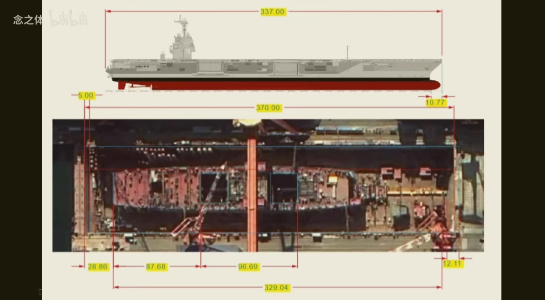 图一是 B站网友做的测量,支墩到舰尾长329米