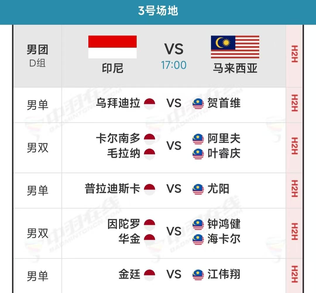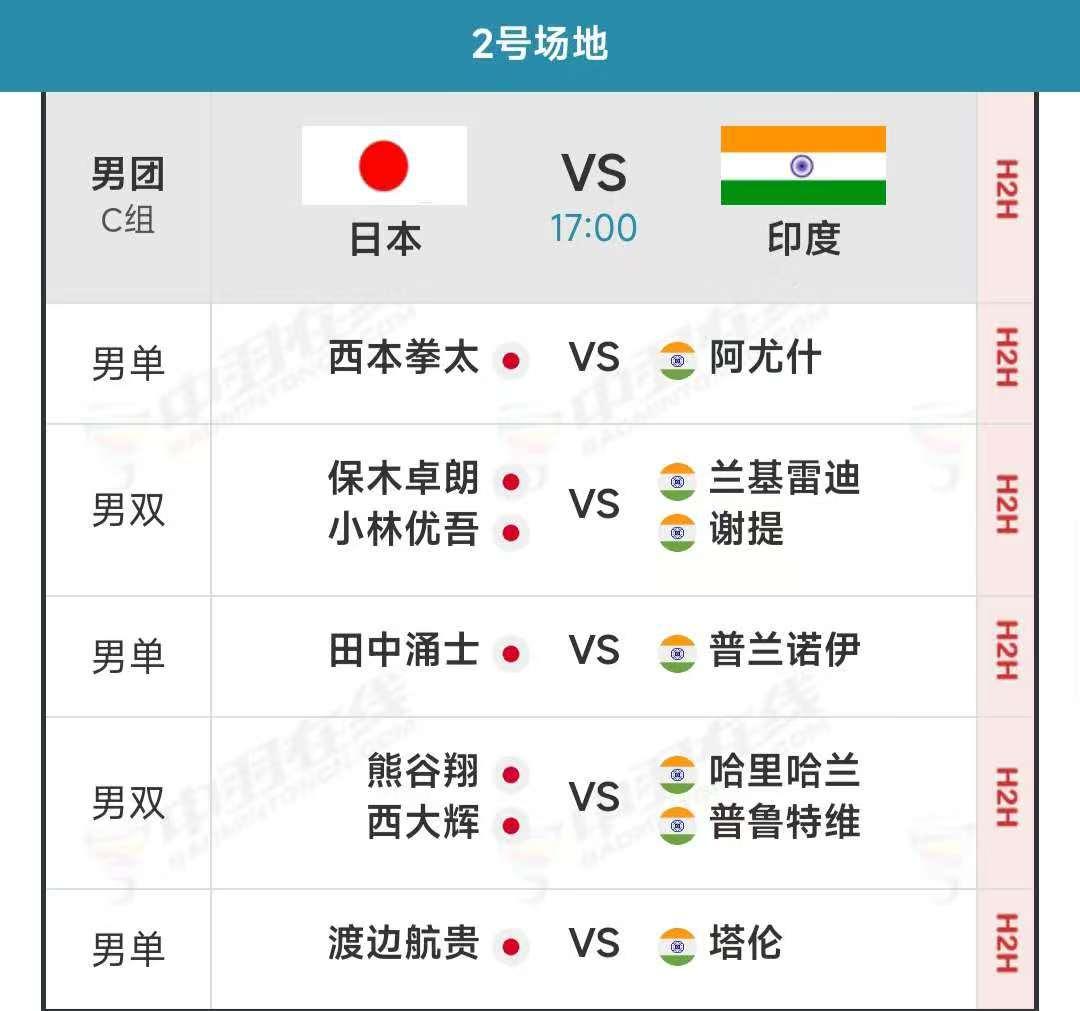 “小手枪”重出江湖 亚洲羽毛球团体锦标赛今天进行小组赛最后一轮的争夺,17点的男团小组赛,四个组都是争夺小组第一的重头戏。中国队派上了本次报名名单中的最强阵容,男双何济霆/任翔宇复出登场,将作为第二双打在比赛中出战。 中国队今天在1号场地比赛,对手是泰国队。两队都已战胜中国澳门队,获得小组出线权,本场比赛是争夺小组第一。中国队在三个单打上派出王正行、胡哲安和董天尧,两对双打是胡珂源/林祥毅以及何济霆/任翔宇。 何济霆/任翔宇已有半年多没有合作了。今年通过调赛,两人重新打回一队,但世界排名已经掉到154位,在本次亚团赛中,只能作为二双出战。 何济霆被暂退出国家队之后,任翔宇也在很长一段时间内,没有搭档。后来与几个年轻选手分别搭档,但参加比赛结果都不好。此次重新与何济霆搭档,希望能找回“小手枪”的辉煌。 此外,今晚其他三组的比赛,也是争夺小组第一,各队派出精锐。韩国队对阵中国台北队,继续雪藏徐承宰,金元昊搭档赵松炫出任一双,姜敏赫/奇东柱继续任二双。中国台北队的两对男双还是李哲辉/杨博轩、王齐麟/邱相榤。 男单方面,中国台北也派出林俊易、王子维和戚又仁。韩国则没有派上昨天击败伍家朗的崔智勋,三名男单是俞泰彬、朴相龙和赵贤祐。 C组的日本队对阵印度队,西本拳太、小林优吾/保木卓朗、兰基雷迪/谢提、普兰诺伊等都将出战。 D组印尼与马来西亚相遇。金廷作为印尼的第三单打出战。
