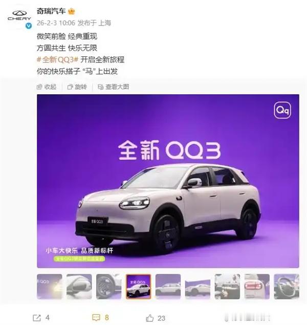 奇瑞经典IP “QQ”正式焕新回归!全新QQ3 将于 2月6日“奇瑞QQ之夜”