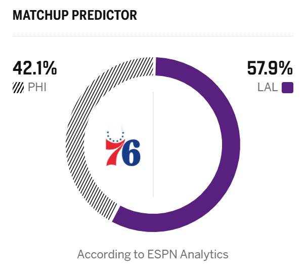 明天上午11点,湖人主场迎战76人,本赛季第50场比赛,ESPN预测湖人胜率接近