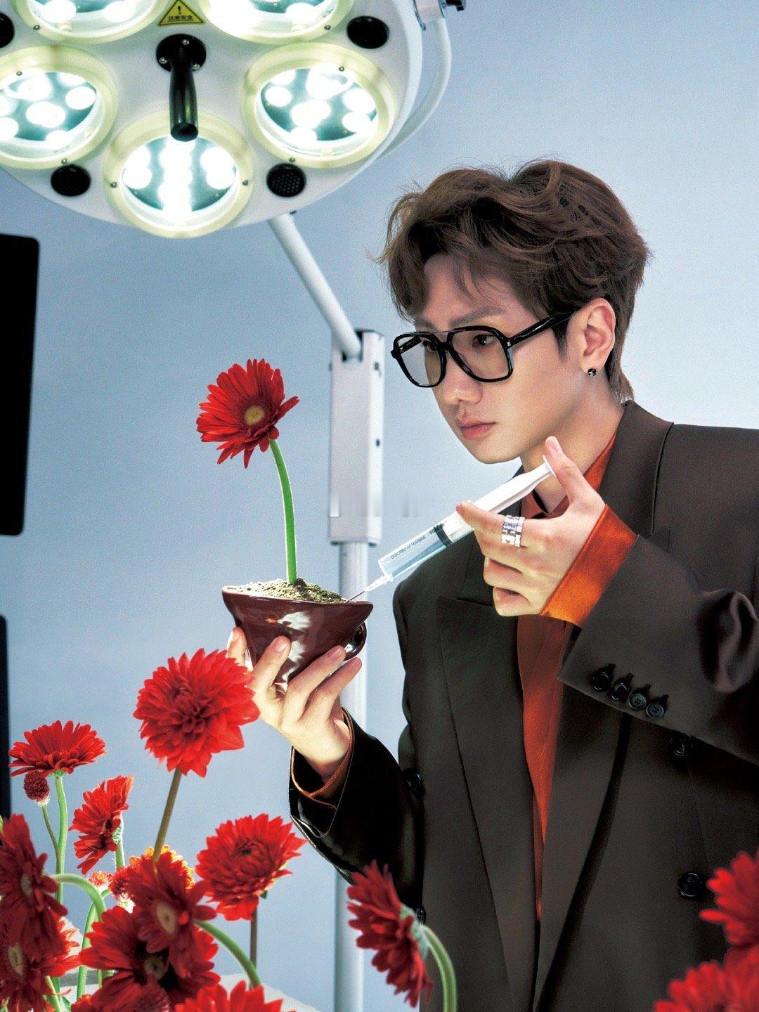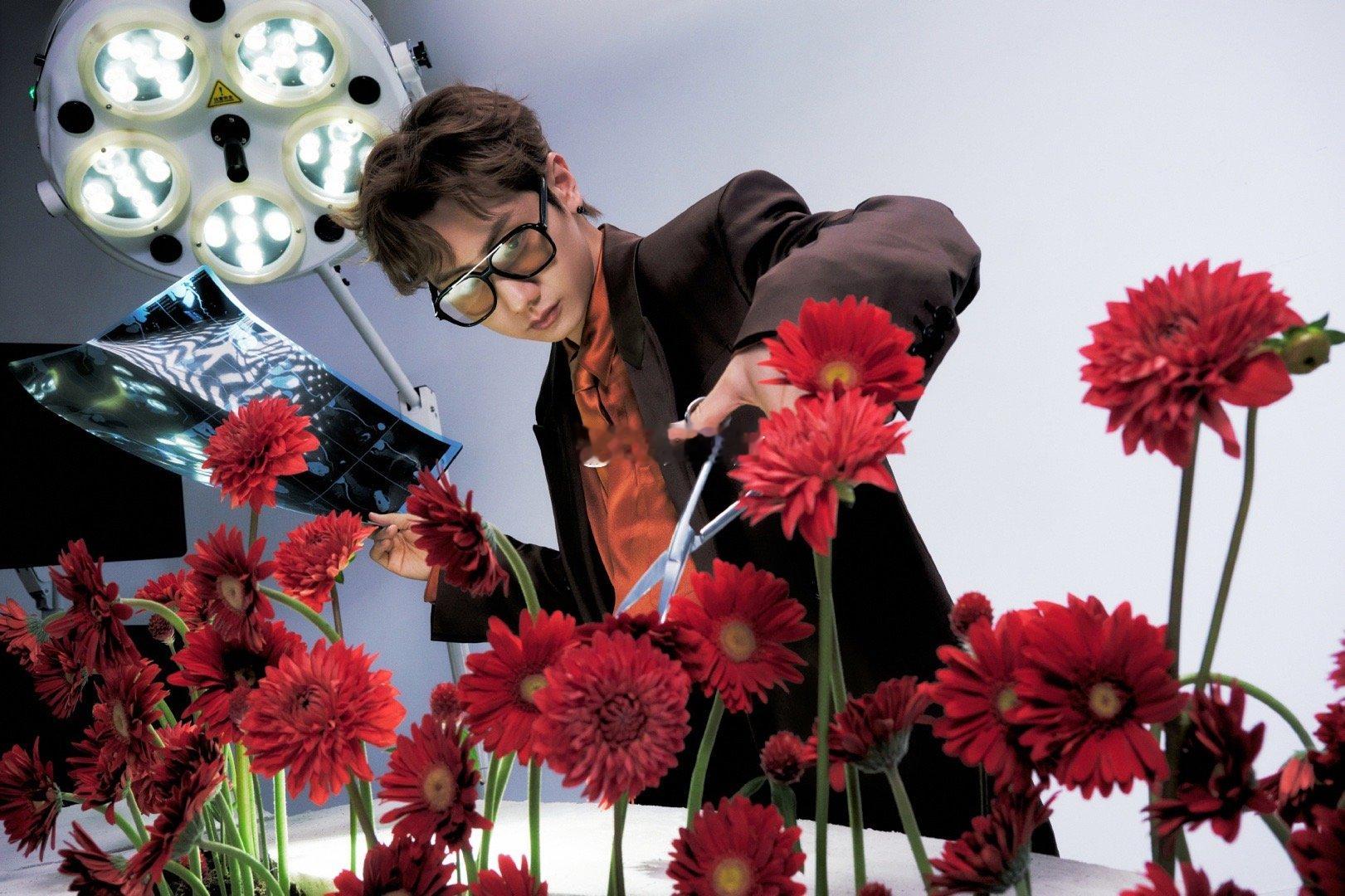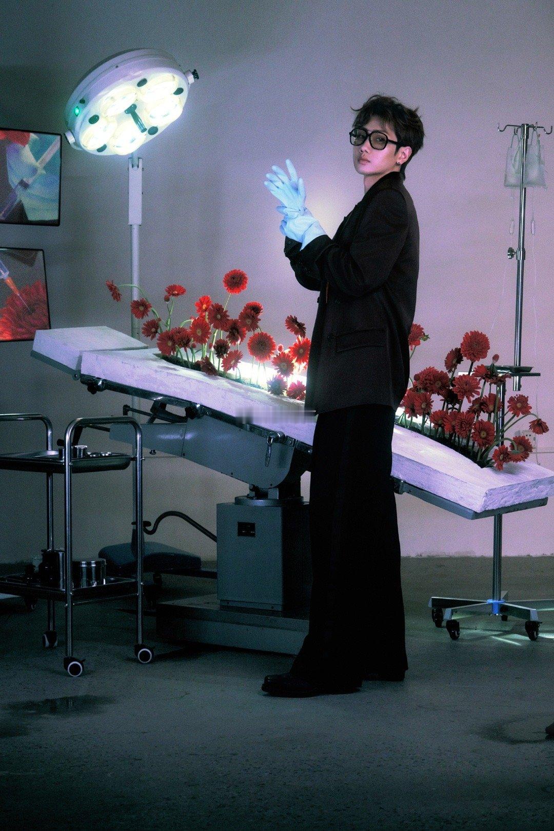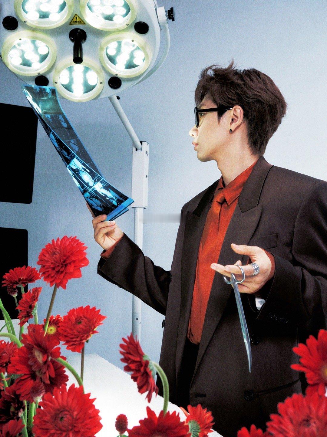 汪苏泷鲜花主刀医生 汪苏泷这组图像一首用手术刀写成的视觉诗。手术室成了他的画布,鲜花是他的颜料,而那些闪着冷光的器械——是他勾勒温柔的笔。黑色西装与复古衬衫的搭配,恰到好处地平衡了专业与温情。