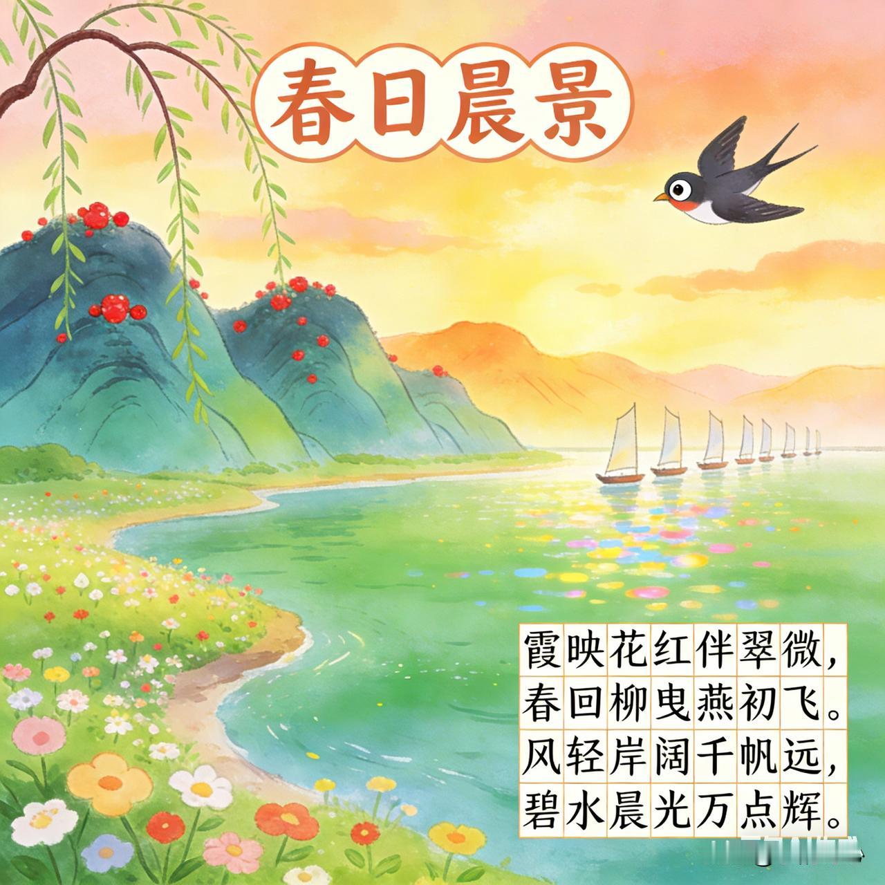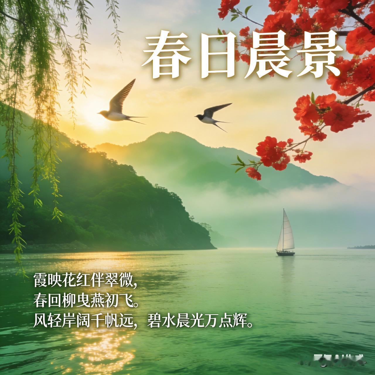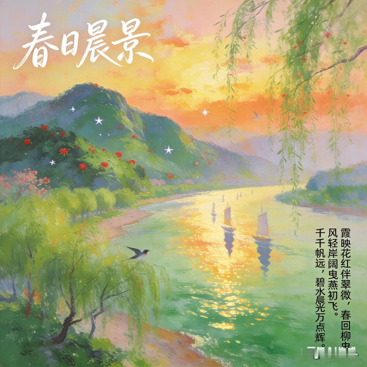 《春日晨景》乐韵诗心原创诗词: 霞映花红伴翠微, 春回柳曳燕初飞。 风轻岸阔千帆远, 碧水晨光万点辉。 这首《春日晨景》以凝练笔触勾勒晨曦胜景:首句"霞映花红"与"翠微"构成冷暖交织的视觉美感,次句"柳曳燕飞"勾勒出生机初萌的动态画面。第三句以"风轻岸阔"拓开视野,千帆竞发的意象暗含对远方的诗意遐思;末句"碧水晨光"化作万点粼粼波光,将天地交融的壮丽定格。全诗以"伴""曳""飞""阔""辉"等动词构建光影流转的时空韵律,最终在"千帆远"的留白中,完成从具象到抽象的意境升华,尽显自然之美与生命律动的和谐交融。