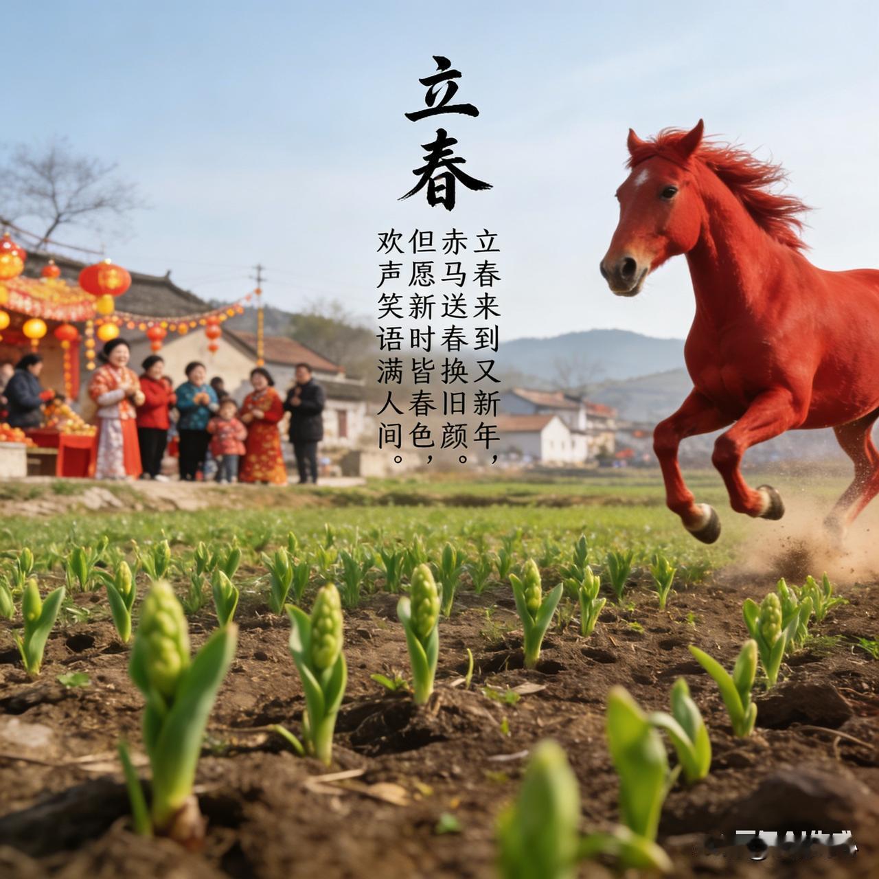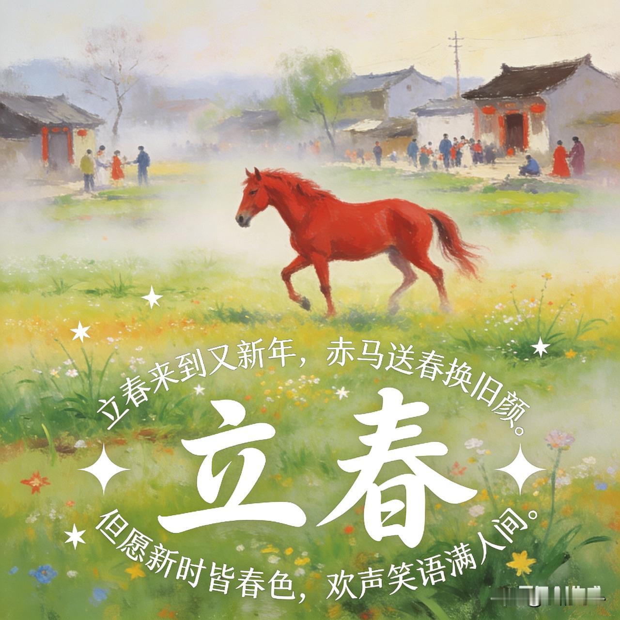 《立春》乐韵诗心原创诗词: 立春来到又新年, 赤马送春换旧颜。 但愿新时皆春色, 欢声笑语满人间。 这是一首立春与新年交织的新春贺诗。首句点明双节相逢的喜庆,次句以“赤马送春”暗合生肖年轮回,展现辞旧迎新的氛围。后两句寄寓美好祝愿,期盼新的一年满目皆春,人间处处洋溢欢声笑语,传递出对新春的喜悦与对美好生活的向往。