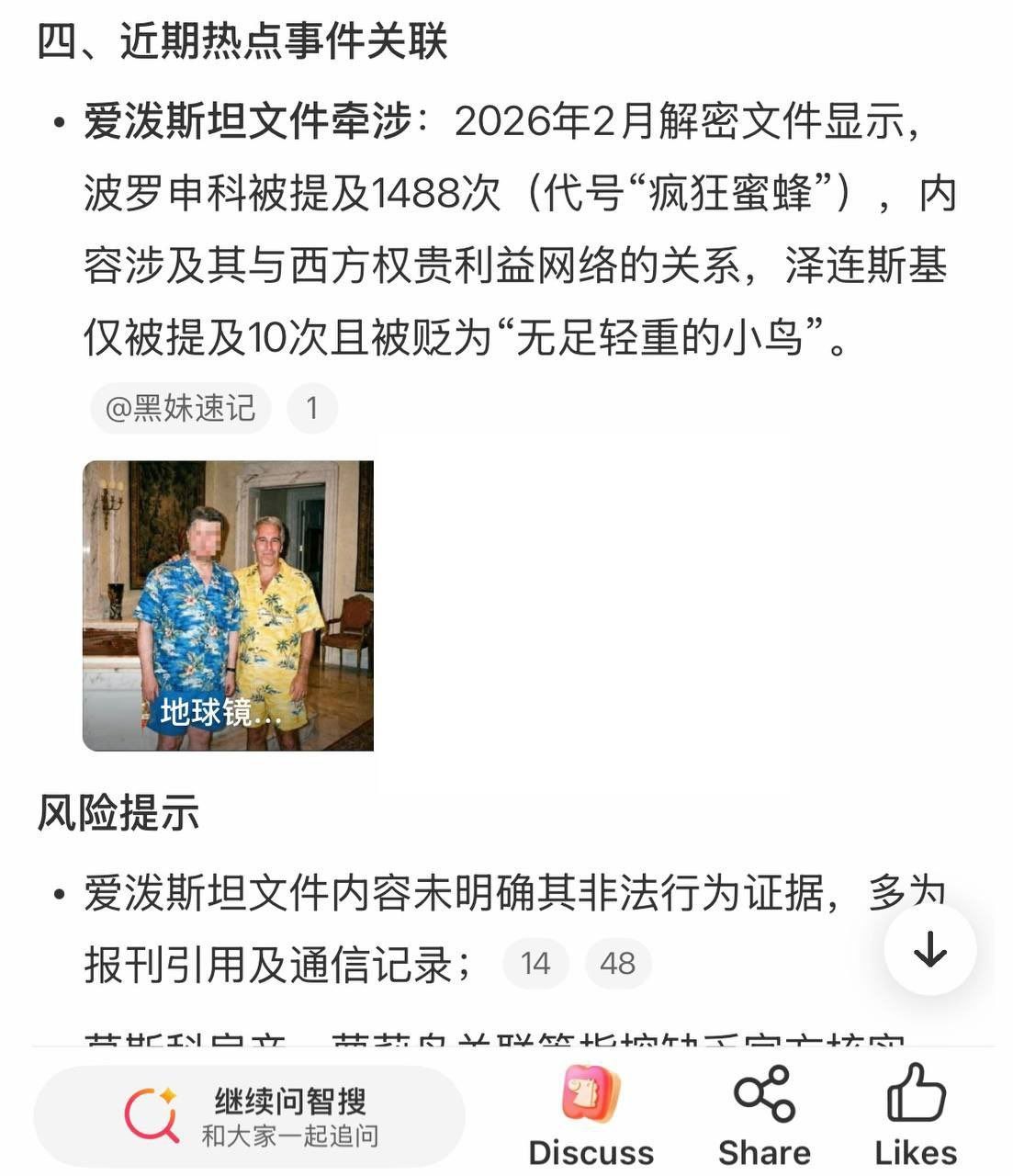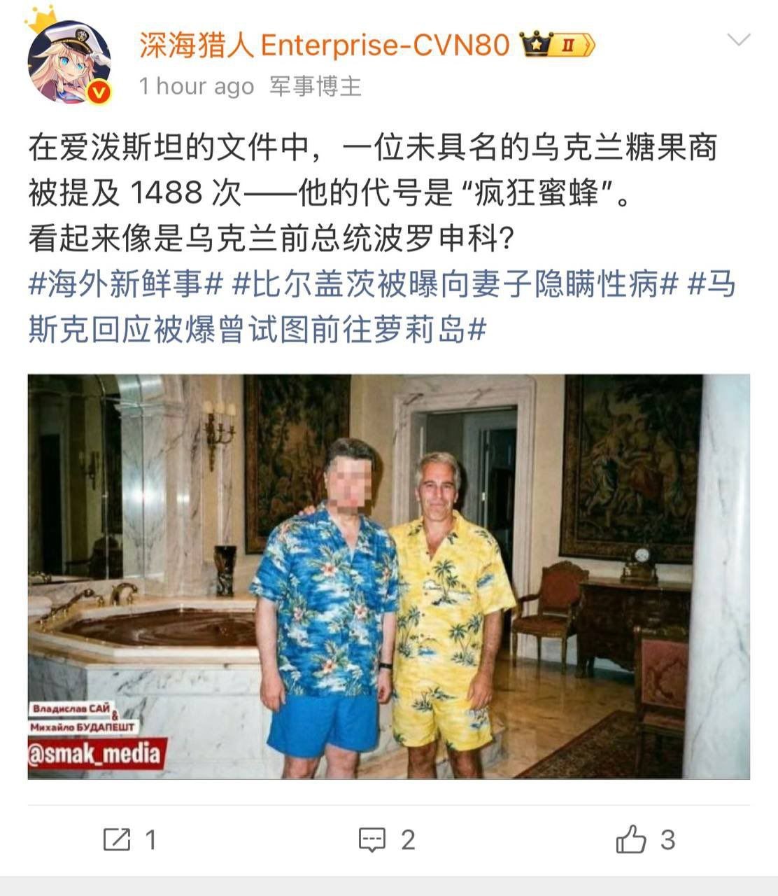 🤣原本只是个玩笑,却被一些观众当真了。 ----------------------------------- : ------------------------回应这条帖子:👉这似乎是一个源自乌克兰的讽刺性梗图,夸大了波罗申科在近期公布的爱泼斯坦文件中被提及的次数(据《基辅独立报》等消息来源称,实际提及次数约为25次)。该梗图已传播到中国社交媒体平台,一些人将其当作事实传播。没有证据表明存在“疯狂蜜蜂”这个化名,也没有证据表明文件中提及过1488次。