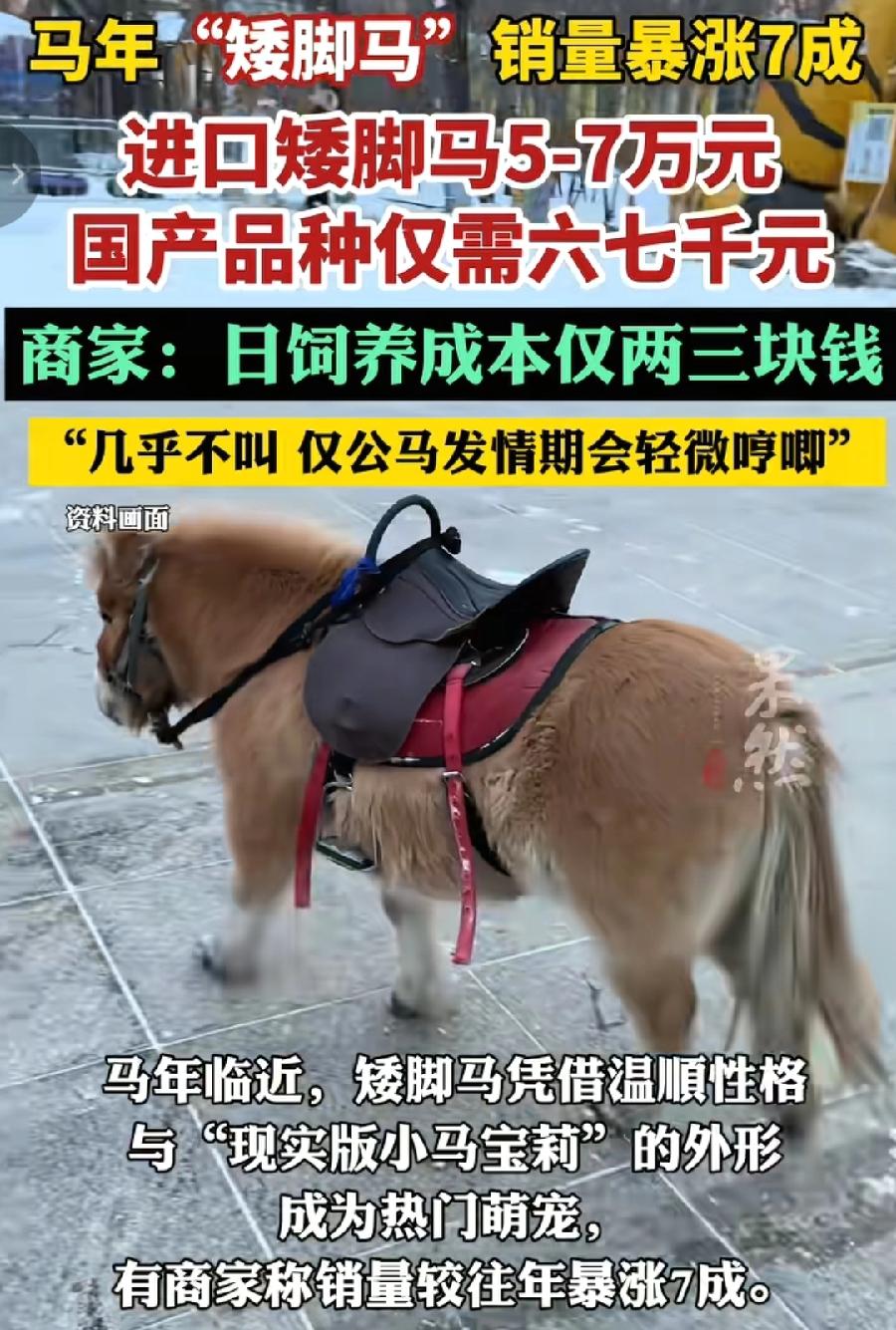 马年,马火了,宠物马来了,养狗不如养马,养矮脚马,现实版小马宝莉!性格温顺,不咬人,小孩大人都能骑,胖嘟嘟的特别可爱!吃得也简单,日饲养成本每天才两三块钱,矮脚马有进口、国产,可选择空间大,性价比超高!不过唯一缺点,英国原产地进口马有点贵,5—7万元,这可比宠物狗贵多了!爱马人士可以考虑,像于谦这样的,你会考虑养一只宠物马吗?