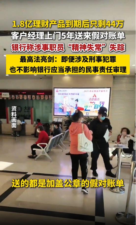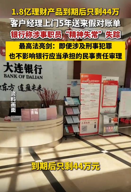 离了个天的大谱!北京,某公证处在银行存了1.8亿,需要用钱时才发现,账户内1.8亿的本息,仅剩44万。蹊跷的是,5年来,银行对账单显示正常。经查,资金早就被转移了,尽管所有证据都摆在面前,银行却不承认,甚至甩锅涉案职员:已精神失常,且早已失踪,客户经理已离职。公证处告上法庭,一审、二审被驳回,1.8亿资金无处追讨。   “你逗我玩呢!存在银行的钱还能凭空消失了?”2018年,北京长安公证处的负责人站在大连银行北京分行大厅里,手抖得几乎拿不住那一沓对账单。   每一张都盖着鲜红的银行公章,清清楚楚写着账户余额1.8亿。可到了取钱时,系统却显示只剩44万。   这不是被盗刷,不是操作失误,而是整整五年间,钱早就被悄悄转走,而银行每个月送来的对账单,竟然全是假的!   这起骇人听闻的案件还要从2013年底说起。当年,公证处把多年积累的公证费陆续存入大连银行,总额达3.6亿元。   银行派了专门的客户经理李某负责对接,李某的服务也相当“周到”,每季度主动上门送对账单、利息回单,纸张正规、印章清晰,从未出过差错。   可谁也没想到,这份“周到”背后居然藏着一个巨大的骗局。原来,开户仅五天,就有人冒充公证处会计,拿着真公章和假签名,从柜台领走了网银U盾。   接着,预留手机号被偷偷改掉,所有转账验证码全发到骗子手机上。从那以后,上亿元资金被分批转到多个空壳公司,甚至直接进了银行内部人员亲属的账户。   而李某就像个“人形道具”,五年如一日地递送伪造的对账单,让公证处一直活在“钱还在”的幻觉里。   直到2018年查账,才发现账户仅剩44万。更离谱的是,事发后银行立马翻脸,说所有文件都是伪造的,涉案员工“精神失常、早已失踪”,客户经理也离职了,责任全推给“个人行为”。   更离谱的是,一审、二审法院居然也信了这套说辞,以“先刑后民”为由驳回了公证处的起诉。   好在最高人民法院没让这事就这么糊弄过去。2026年初,最高法明确裁定:银行和储户之间有真实合同关系,员工犯罪不能成为银行免责的理由。   而且对账单盖的是银行章,送的是银行人,储户凭什么要怀疑?真正的问题是银行内控形同虚设:U盾能被冒领、手机号能被随意更改、五年没一次风险预警。   这些可怕的漏洞,怎么能简单归结于“个别员工作案”?系统性失守才是最根本的问题!   试想一下,如果连银行都能失信于储户,那老百姓的财产安全又该仰仗于谁?   说到底,银行不是普通商铺,它是国家金融体系的基石。老百姓把钱存进去,信的不是某个柜员,而是整个制度。可如今出了事,银行用一句“人跑了、章是假的”就甩锅,那谁还敢把积蓄放进去?   好在司法最终没有纵容这种推诿。如今案子还在审理,但那句“钱还能凭空消失?”已经成了无数人心中的警钟。   它提醒所有金融机构:安全不是口号,而是每一位储户沉甸甸的信任,更是从业者必须守住的底线!   对此你有什么看法?欢迎在评论区留言讨论。正能量 致敬   信息来源: 大河网2026-2-4|1.8亿元理财仅剩44万元 大连银行案件多重问题待解 文|墨海 编辑|史叔