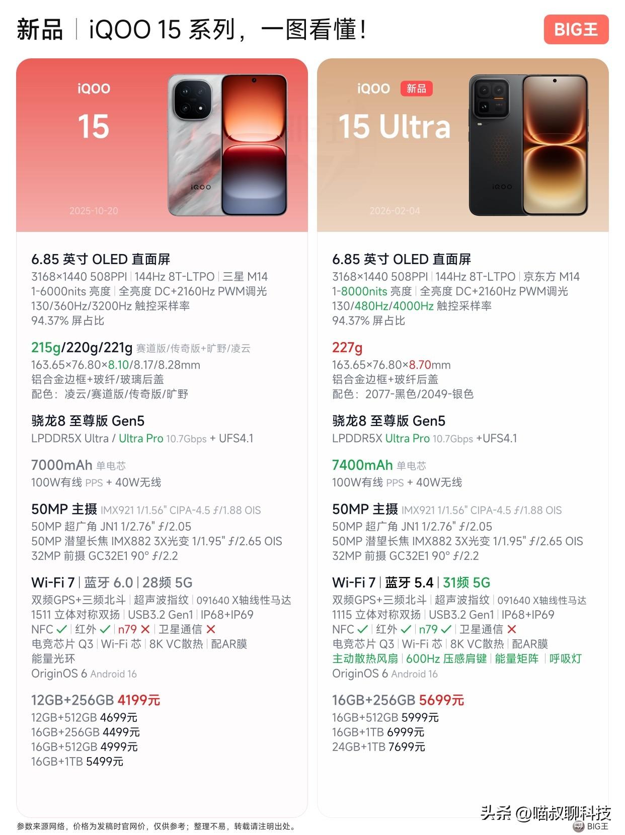 IQOO 牛哇!15 Ultra 居然还出了个24G+1TB... 现在这内存价格都涨疯了,不少机型连16G+1TB都给砍了,IQOO这波是真的很硬气~ 不过这价格也确实很 Ultra,顶配皇帝版的售价已经来到了7699,已经完全不逊色于华为、苹果旗舰。 具体价格: 16G+256GB —— 5499元(国补价4999元) 16G+512GB —— 5999元(国补价5499元) 16G+1TB —— 6999元 24G+1TB —— 7699元 就配置而言,对于比IQOO 15标准版 增加了主动散热风扇,能够更好的释放性能,游戏体验会更优秀; 增加了物理肩键,射击类游戏操作更加便捷; 屏幕升级为三星2K珠峰屏,功耗控制的更好,局部亮度更高; 另外还有非常炫酷的呼吸灯带,电池容量也有一定的提升。 不知道大伙觉得这个升级对得起这个售价吗?