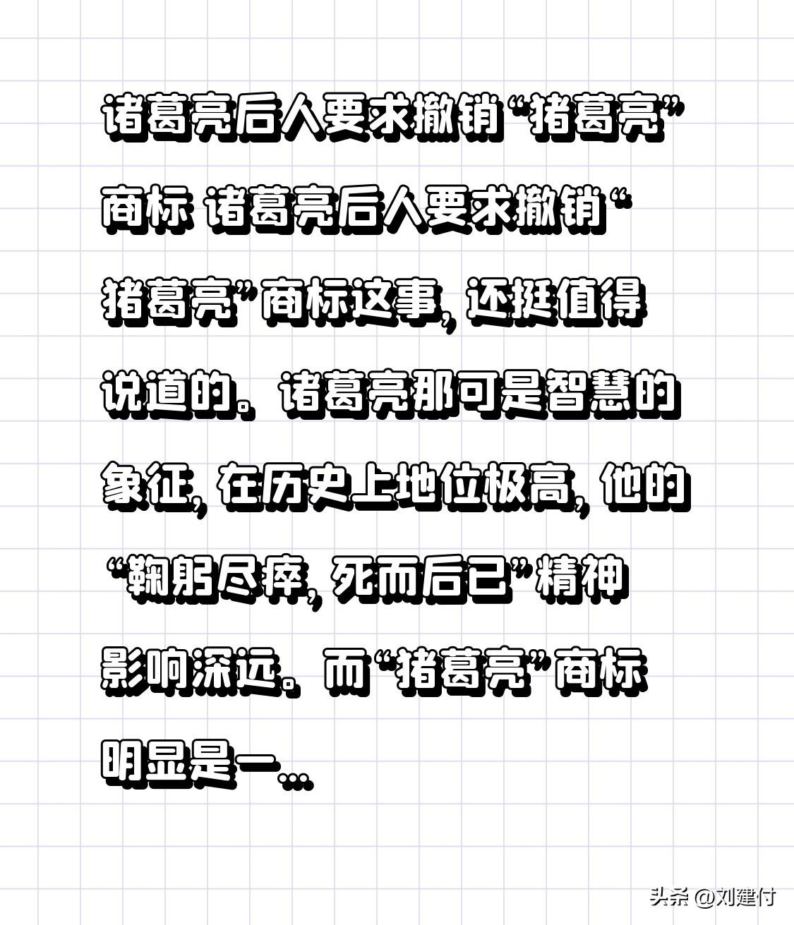 诸葛亮后人要求撤销“猪葛亮”商标 诸葛亮后人要求撤销“猪葛亮”商标,此事值得探讨。诸葛亮是智慧的象征,在历史上地位极高,其“鞠躬尽瘁,死而后已”的精神影响深远。而“猪葛亮”商标明显是恶搞。 商标用于区分商品或服务来源,以谐音恶搞历史名人博眼球,实在不妥。这既不尊重历史文化,也伤害名人后裔感情。我们不能随意调侃、亵渎为社会做贡献的人,对待历史名人要有敬畏之心。希望相关部门重视,撤销此不当商标。