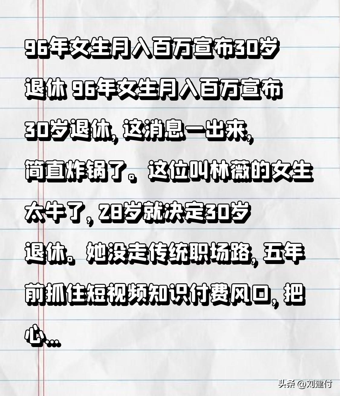 96年女生月入百万宣布30岁退休 96年女生月入百万宣布30岁退休,消息一出,舆论哗然。这位名叫林薇的女生太厉害了,年仅28岁就决定30岁退休。她没走传统职场道路,五年前抓住短视频知识付费风口,将心理学和职场沟通技巧做成课程,全网粉丝超500万,被动收入占七成。 她算过,按当下资产增值和极简开销,退休后靠投资收益即可。她在大理买了带小院的房子,打算退休后读书、养花、看极光。有人说她“躺平”,可这分明是奋斗后的主动选择。咱普通人只能一边羡慕,一边学习她明确目标、抓住机遇的本事。从娘胎里就退休,才称传奇人物形象退休。