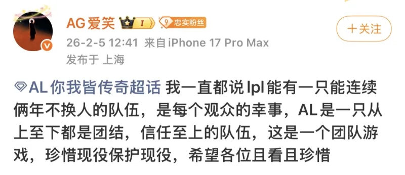 又开始了...爱笑发文:我一直都说LPL能有一只能连续俩年不换人的队伍,是每个观众的幸事,AL是一只从上至下都是团结,信任至上的队伍,这是一个团队游戏,珍惜现役保护现役,希望各位且看且珍惜 。