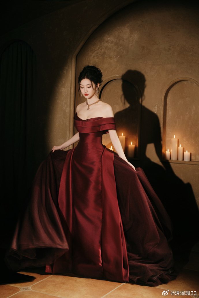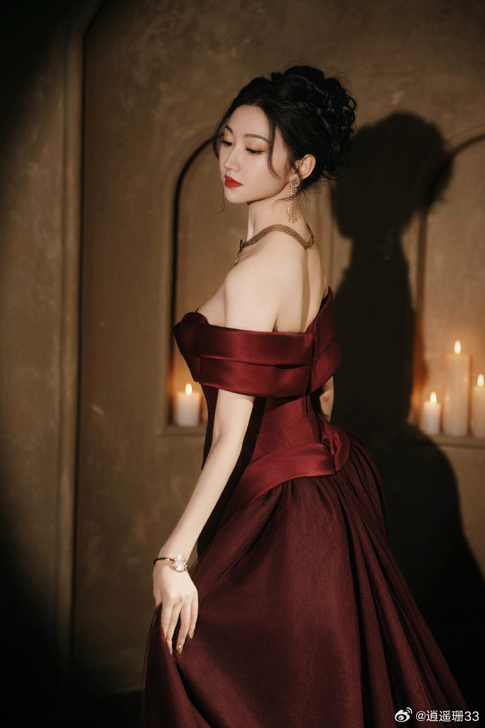 红色礼服衬得肩线又直又顺,从锁骨到肩颈的弧度太绝了,连颈链都像是为她量身定做的一样。烛光里抬眼的瞬间,肩颈线条随着动作轻轻舒展,完全是自带柔光滤镜的程度!谁看了不喊一句姐姐鲨我!