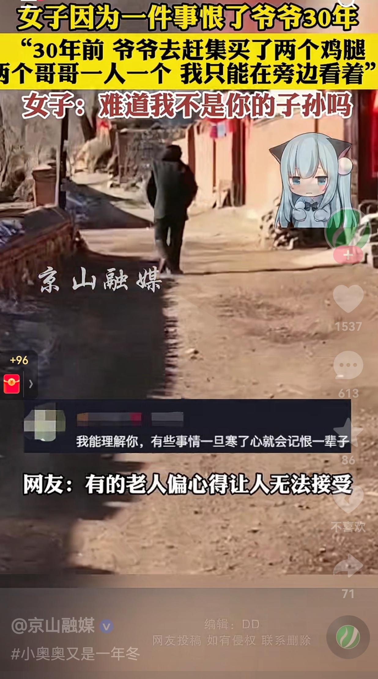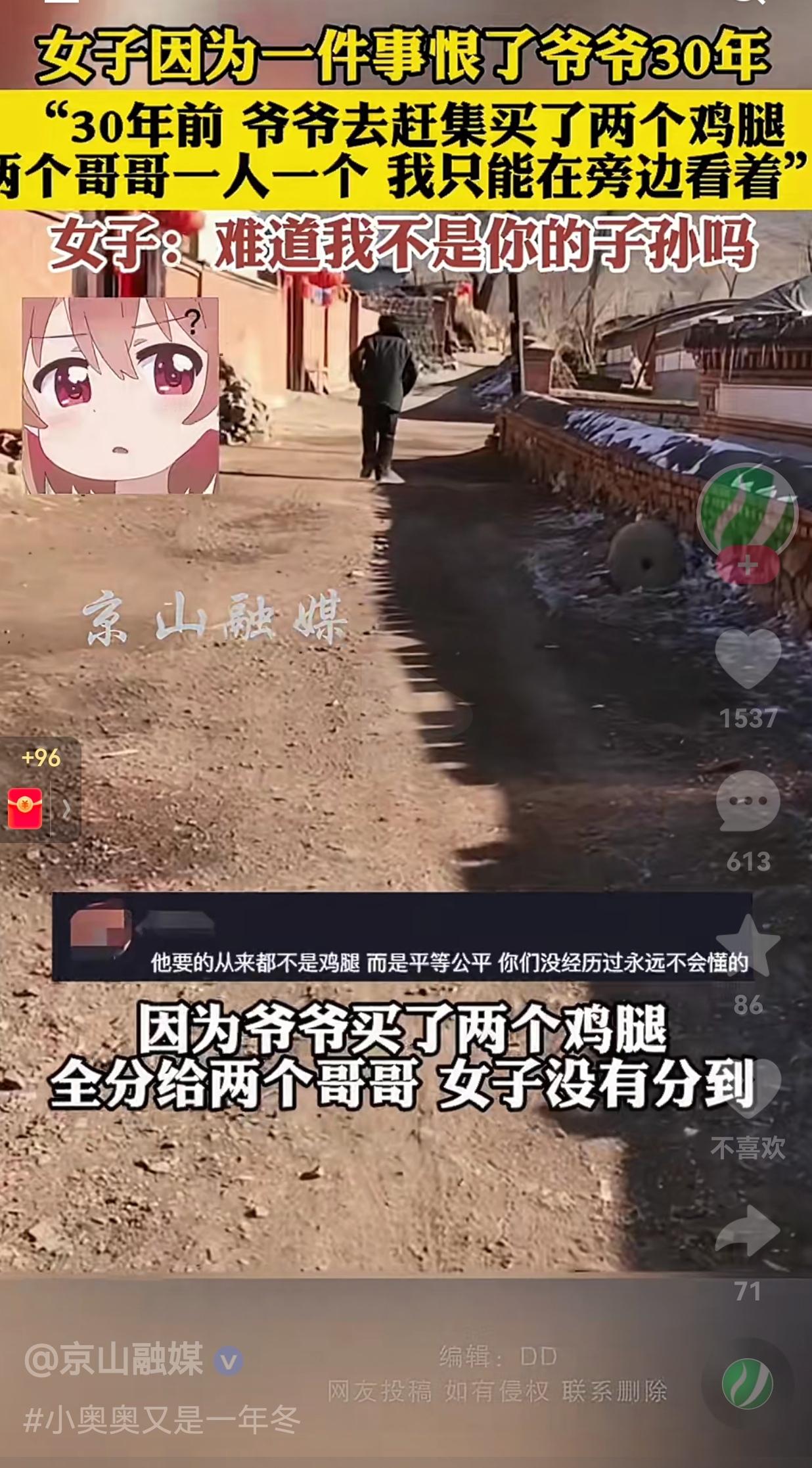 都是重男轻女惹的祸!一女子因为一件事恨了爷爷30年,就因为爷爷赶集买了两个鸡腿,两个哥哥一人一个,自己只能在旁边干看着。网友:真不是小心眼!小时候的委屈从来都不是小事,一根糖一块肉的偏心,能记一辈子。 一位女士说,30年前爷爷赶集回来,买了两个鸡腿,直接塞给了两个哥哥,就她一个人站在旁边看着,连个鸡腿渣都没分到。 她对着镜头红着眼问:“难道我不是你的子孙吗?” 就因为这两个鸡腿,她记恨了爷爷整整30年。 网友看到后评论说:“至于吗?不就是个鸡腿?”但我太懂这种感受了。 我想起小时候,奶奶每次做红烧肉,都会把最肥的那块夹给堂弟,说“男孩子要多吃肉长身体”,而我只能啃着瘦肉,假装不在意。 现在回头看,那块肉本身不重要,重要的是被区别对待的瞬间,那种“我是不是不够好”的自我怀疑,才是刻在骨子里的疼。 视频里有句评论说得特别戳心:“她要的从来都不是鸡腿,而是公平公正地被爷爷对待。” 那个年代的老人,大多带着重男轻女的观念,其实,他们不是不爱孙女,只是在他们的认知里,孙子才是根。 所以,他们会把最好的东西紧着孙子吃,如果有剩下的,再给孙女吃。如果没有,那就算了吧! 在老一辈的眼里,这是一件再正常不过的事情,可是,在孩子的世界里,他们根本考虑不了那么多,他们只会觉得爷爷只爱哥哥,却不爱我。 这两个鸡腿,现在成了她心里过不去的坎,也成了很多被偏心对待过的孩子的缩影。 我们总说“长辈都是为你好”,却忘了孩子的委屈从来都不是小事。 一个被老人偏爱的孩子,长大后心里是暖暖的。而被忽略的那个孩子,哪怕过了30年,还是会在某个深夜想起:为什么他们这么对待我呢? 对此,你有什么看法呢?