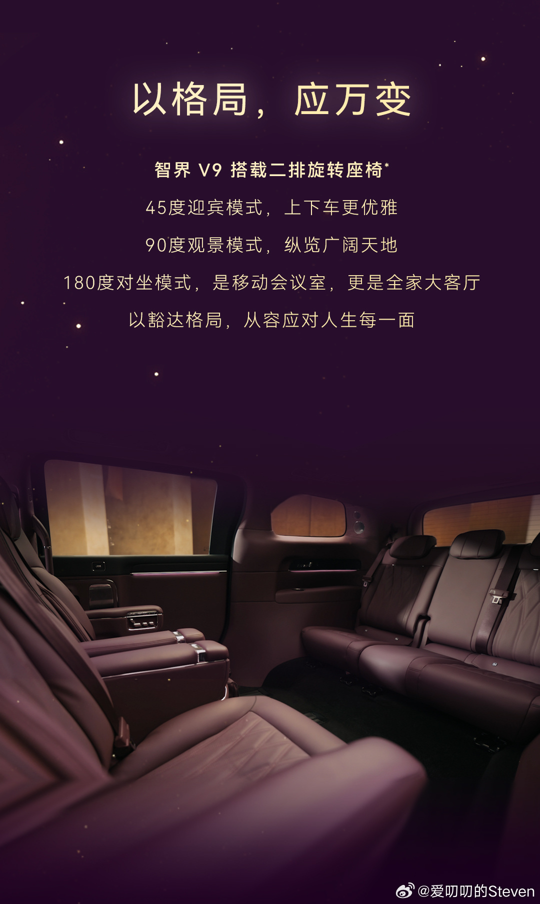 45度,90度,180度。迎宾模式,会谈模式,钓鱼模式,家庭模式,0~180度的座椅角度变换也让车内空间和使用场景变得更灵活多变。大家应该能看出一些V9的方向了吧。有点期待发布会,余总会怎么介绍。鸿蒙智行旗舰MPV智界V9内饰首发余承东官宣智界V9绒霞紫内饰
