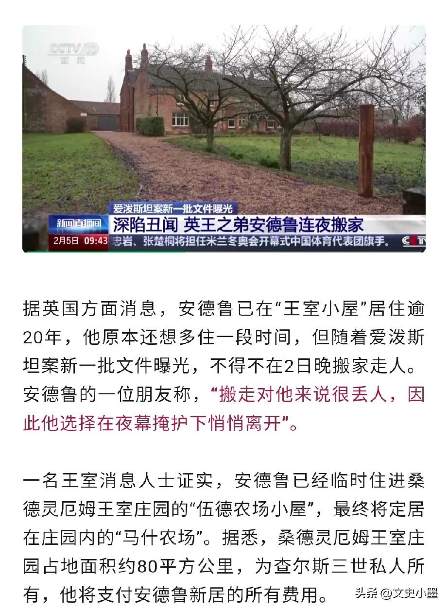 安德鲁怕丢人,趁着夜色悄悄的搬出了温莎城堡的王室小屋,毕竟他在这里住了20多年! 作为已故英国女王伊丽莎白二世次子,现任英国国王查尔斯三世的亲弟弟,安德鲁本来可以受人敬仰,无忧无虑的享受着王子生活,但一切都因爱泼斯坦性丑闻事件改变了! 他不但被哥哥查尔斯三世剥夺了王子头衔,而且还被赶出了王子府邸,但念在是自己亲弟弟的份上,查尔斯三世让他搬到了自己的私人农场去住! 安德鲁一手好牌,打的稀烂!打破了王室成员庄重、守礼的高贵形象,让英国王室蒙羞,只能自食其果!