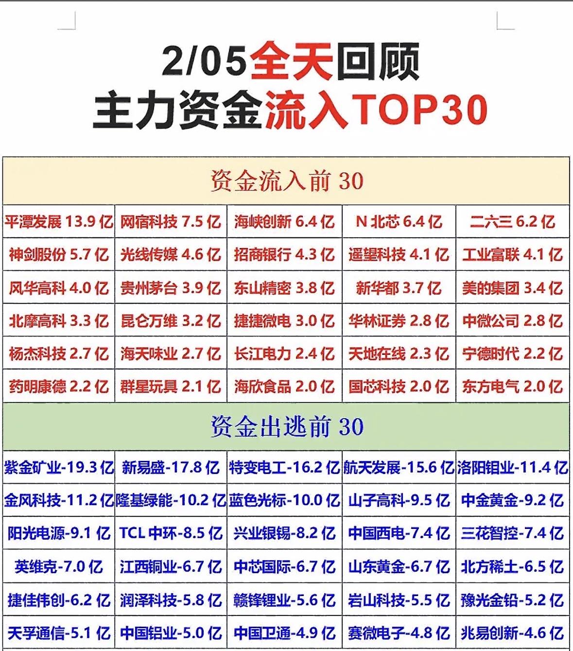 2/05主力资金流入TOP30,快来看看哪些公司最受欢迎! 主力资金青睐平潭发展等股,紫金矿业遭大幅抛售,市场资金流向分化明显。