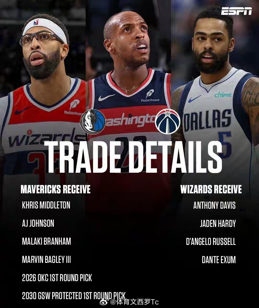 2月5日,据ESPN名记独家爆料,10届全明星内线安东尼·戴维斯被独行侠交易至奇才,这笔涉及10人+5个选秀权的大交易,成为NBA近期最重磅的阵容调整。本次交易具体筹码为:独行侠送出浓眉、哈迪、拉塞尔、埃克萨姆四位球员,从奇才换来米德尔顿、AJ·约翰逊、布兰纳姆、巴格利,外加2个首轮签和3个次轮签,选秀权与即战力双收。浓眉本赛季为独行侠出战20场常规赛,场均交出20.4分11.1篮板的两双数据,依旧保持顶级内线的攻防水准。独行侠此番操作显然意在积攒未来筹码,5个选秀权的加入让球队重建之路有了更多选择;而近期战绩低迷(近10场1胜)的奇才,得到浓眉这位全明星内线,将直接补强球队孱弱的内线攻防,为阵容注入核心战力。这笔交易堪称联盟格局的一次小洗牌,浓眉加盟奇才后能否带领球队走出低谷,独行侠的选秀权储备能否转化为重建成果