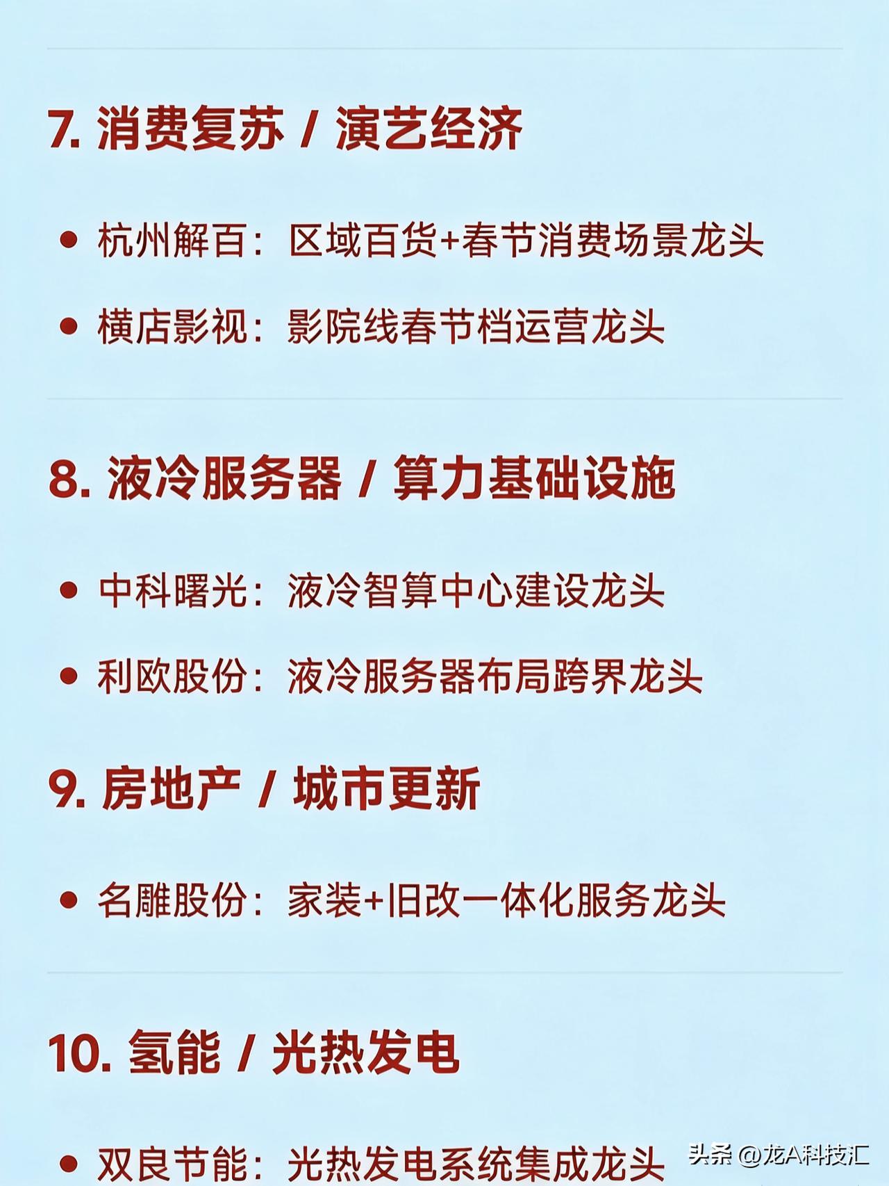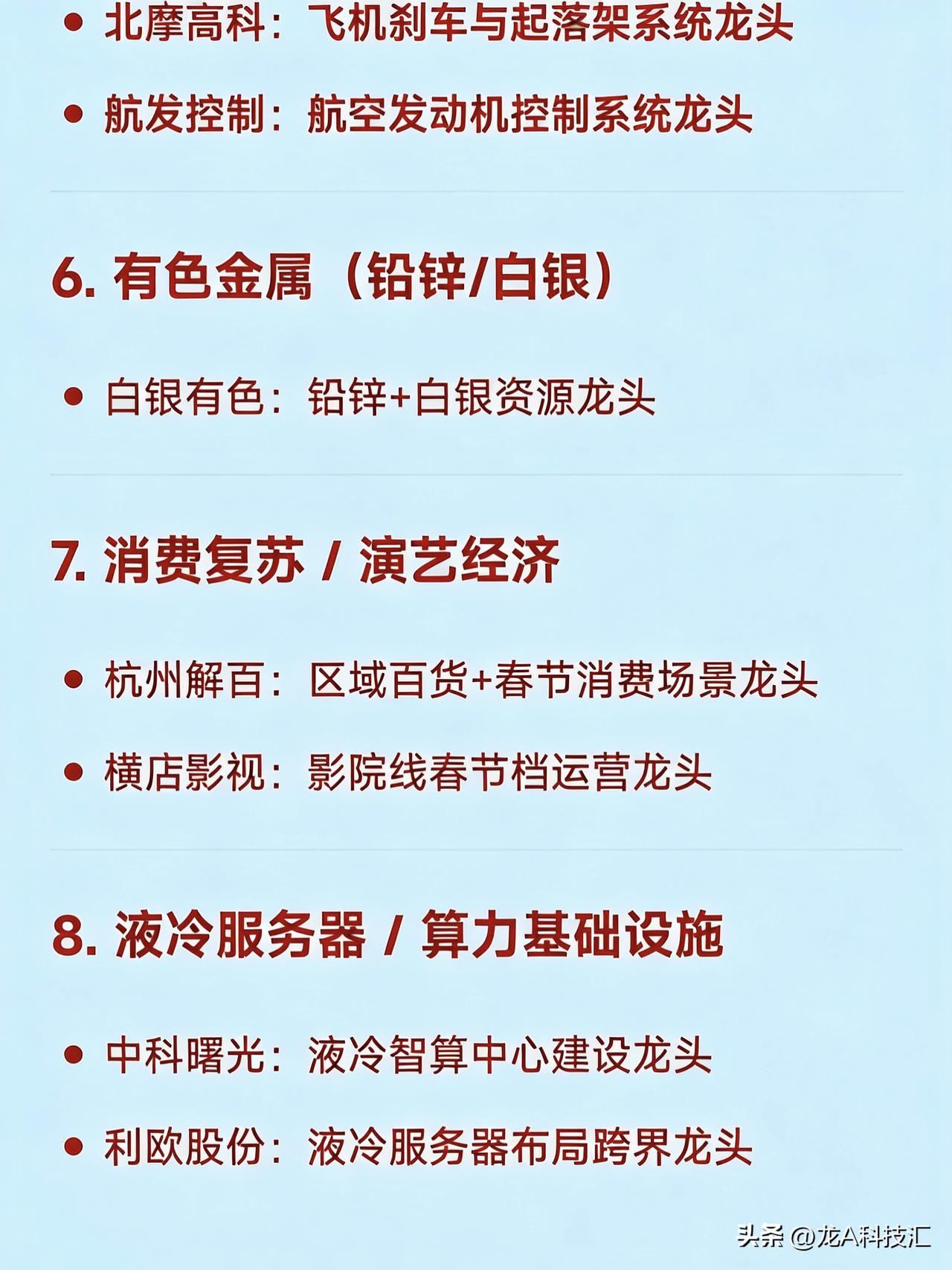 2026年2月5日十大热点科技及其产业链核心龙头 1. 太空光伏 / 钙钛矿电池 协鑫集成:钙钛矿叠层电池技术龙头 TCL中环:BC/TOPCon高效硅片与电池龙头 拓日新能:HJT及柔性光伏组件龙头 双良节能:光热+光伏设备一体化龙头 国晟科技:异质结(HJT)电池量产龙头 2. AI营销 / 社交平台数字营销 利欧股份:快手/小红书AI营销服务龙头 蓝色光标:AIGC全域营销龙头 浙文互联:社交内容智能投放龙头 遥望科技:直播电商AI营销整合龙头 3. 商业航天 / 低轨卫星 巨力索具:火箭发射支撑系统龙头 航天发展:军工信息化与卫星通信龙头 航宇微:商业遥感卫星载荷龙头 4. 煤炭 / 动力煤资源 陕西黑猫:焦化煤化工区域龙头 大有能源:河南动力煤主力供应龙头 5. 大飞机 / 航空航电 北摩高科:飞机刹车与起落架系统龙头 航发控制:航空发动机控制系统龙头 6. 有色金属(铅锌/白银) 白银有色:铅锌+白银资源龙头 7. 消费复苏 / 演艺经济 杭州解百:区域百货+春节消费场景龙头 横店影视:影院线春节档运营龙头 8. 液冷服务器 / 算力基础设施 中科曙光:液冷智算中心建设龙头 利欧股份:液冷服务器布局跨界龙头 9. 房地产 / 城市更新 名雕股份:家装+旧改一体化服务龙头 10. 氢能 / 光热发电 双良节能:光热发电系统集成龙头
