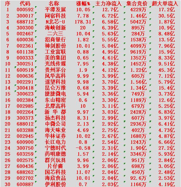2月5日收盘,主力资金,已经大幅卖出的30名单 紫金矿业:净流出 22.8亿元 新易盛:净流出 18.1亿元 航天发展:净流出 17.0亿元 特变电工:净流出 15.4亿元 金风科技:净流出 12.2亿元 洛阳钼业:净流出 12.0亿元 蓝色光标:净流出 11.5亿元 隆基绿能:净流出 11.0亿元 中金黄金:净流出 10.3亿元 山子高科:净流出 9.72亿元 2月5日收盘,主力资金“大幅买入”的30名单: 平潭发展:净流入 12.7亿元 网宿科技:净流入 6.72亿元 N北芯-U:净流入 6.58亿元 海峡创新:净流入 6.39亿元 二六三:净流入 5.63亿元 招商银行:净流入 5.55亿元 神剑股份:净流入 5.04亿元 工业富联:净流入 4.95亿元 美的集团:净流入 4.61亿元 光线传媒:净流入 4.38亿元 贵州茅台:净流入 4.12亿元 风华高科:净流入 3.99亿元 遥望科技:净流入 3.70亿元 昆仑万维:净流入 3.39亿元 捷捷微电:净流入 3.36亿元 东山精密:净流入 3.30亿元 北摩高科:净流入 3.11亿元 新华都:净流入 3.03亿元 扬杰科技:净流入 2.99亿元 中微公司:净流入 2.92亿元