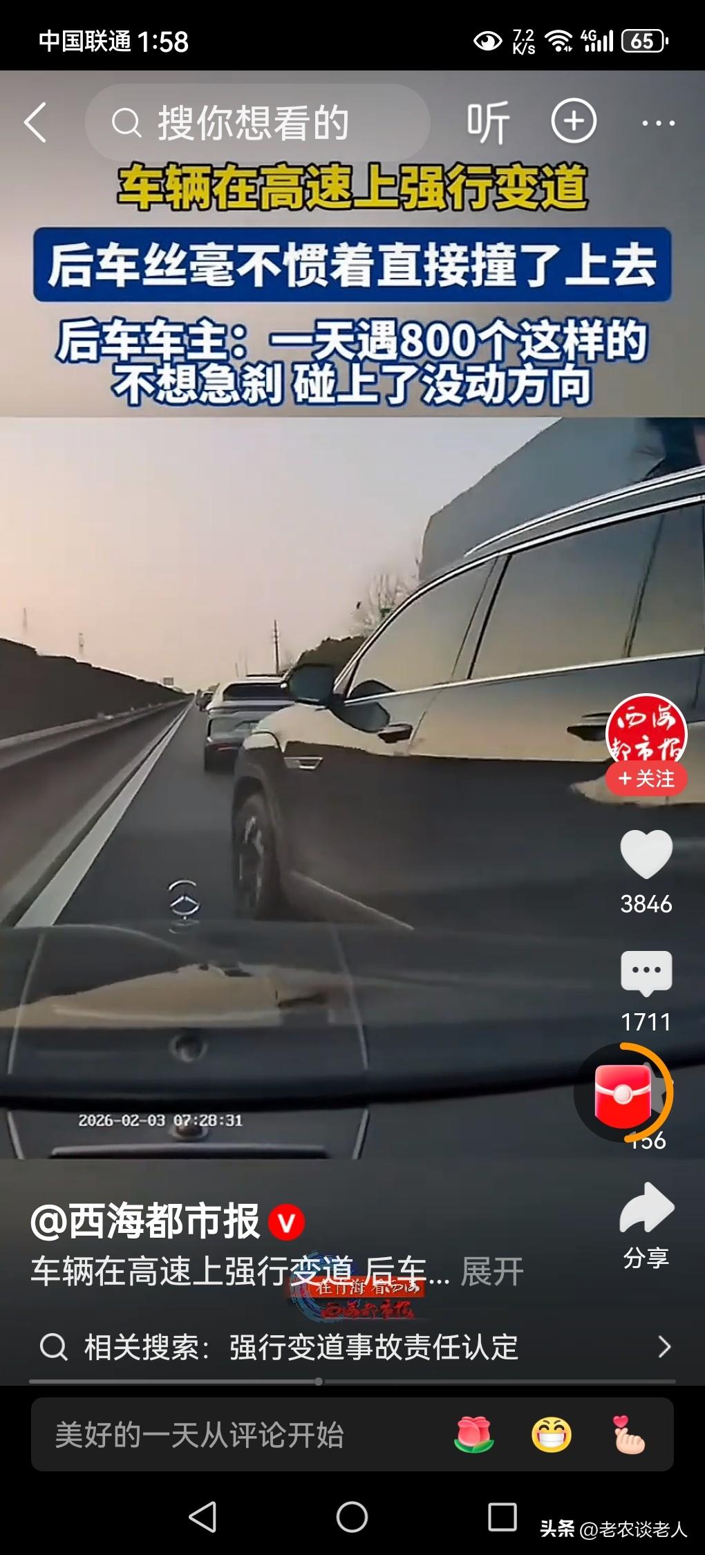 车辆高速强行变道,后车直接撞了! 又到一年回家过年的时候了,驾车从高速公路回家的朋友们,在驾车的时候千万要注意,车辆高速强行变道,是违反高速交通管理规定的,要付沉重的代价的。 因此,敬请驾车的朋友们既不要以身试法,又要避免车毁人亡的悲惨事故的发生。 据媒体2月5日报道,在某一高速公路上,紧跟着大货车后面的小汽车突然变道的时候,却被后面正常行驶的小汽车直接撞了上去,一起强行变道的交通事故发生了。 从视频上看来,这起交通事故是完全人为的,并且是完全能够避免的。因为,后面正常直行的这辆直撞的车,只要稍稍踩一下刹车,只要减一点速,两辆小车就不会相撞。 为什么这两辆车又相撞了呢? 因为,后面的车子是正常行驶,并没有违规,但是缺少道德修养,若是稍加礼让前车一点,这一起交通事故就不会发生。 最终,货车后面的小汽车强行变道,虽然违规,但是也是迫于无奈之举,是不得已而为之的事情,最终被后车直撞了,应该承担所有的全部责任。 而后面相撞的那台小车,是完全可以避免车辆相撞的,能够踩一点刹车,就能完全避免这一起交通事故的发生,虽然不担责,但是非常缺少良心道德,完全不顾人家的财产和生命安全,是应该受到良心的谴责的。可是,这位司机并没有这样做,并没有被良心和道德唤醒,直接撞了上去,从道德层面上来说是一种缺乏道德修养的人,是大不应该的。司机虽然没有违规,但是难逃道德的谴责的。 通过此事例,我们回到现实生活中来,本人认为,高速公路驾车是一件危险的事情,稍有不注意就会发生意外的交通事故。回家过年的朋友们在驾车经过高速的时候,既要遵守交通规则,又要礼让他人,确保道路交通安全,能够顺利回家过年,避免所有交通事故的发生。 以上是本人观点,如有不妥,请大家在留言区处,留下你宝贵的意见,并积极参与评论,特邀请大家一起参与高速公路行车安全的讨论。 春节与智己从容出行车辆高速强行变道 后车直接撞了