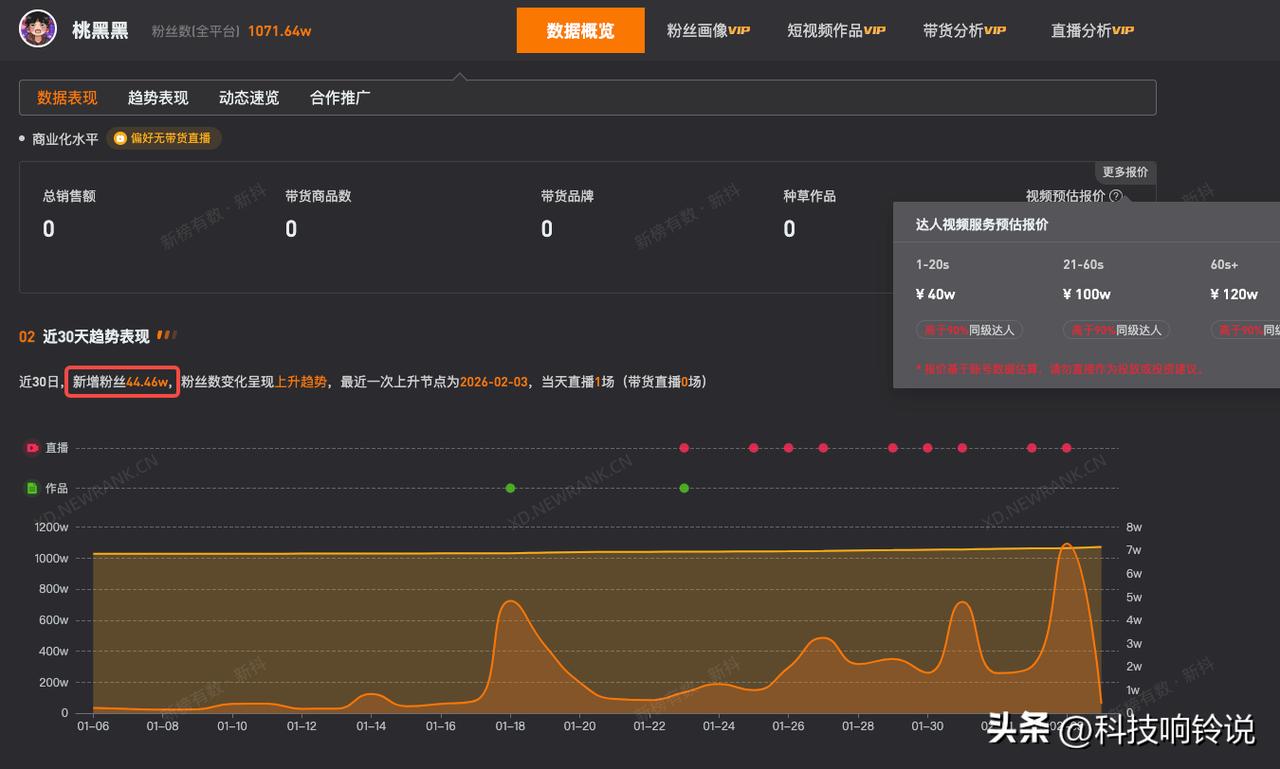 【桃黑黑近30日涨粉44万 桃黑黑1分钟视频报价120万】桃黑黑47分钟谈心局 近日,主播桃黑黑因健康问题临时取消直播引发争议后,于2月5日发布47分钟谈心视频,相关话题引发网友讨论。 第三方数据显示,“桃黑黑”视频平台账号近30日涨粉44.46万。商业化水平显示,其1-20s视频预估报价为40万,21-60s视频预估报价为100万,60s以上视频预估报价为120万。 天眼查知识产权信息显示,福建一公司已成功注册“桃黑黑”商标,国际分类包括服装鞋帽、家具、布料床单等。 天眼查信息:桃黑黑
