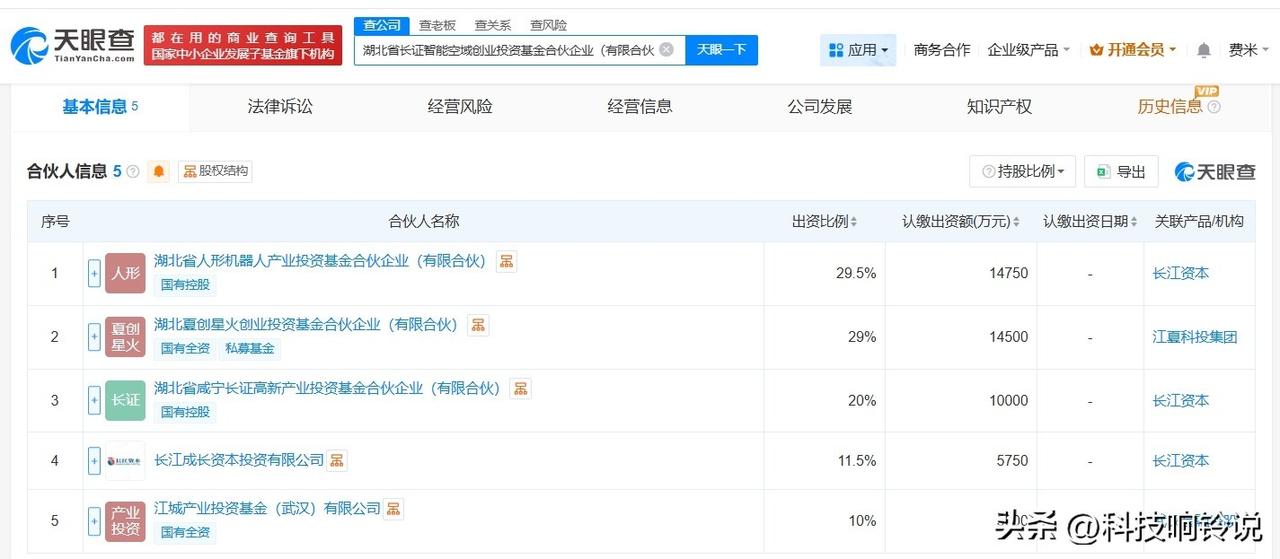 【湖北省长证智能空域创业投资基金登记成立 出资额5亿】 天眼查App显示,近日,湖北省长证智能空域创业投资基金合伙企业(有限合伙)成立,执行事务合伙人为长江成长资本投资有限公司,出资额5亿人民币,经营范围为私募股权投资基金管理、创业投资基金管理服务,创业投资,由湖北省人形机器人产业投资基金合伙企业(有限合伙)、湖北夏创星火创业投资基金合伙企业(有限合伙)、湖北省咸宁长证高新产业投资基金合伙企业(有限合伙)等共同出资。 天眼查信息: