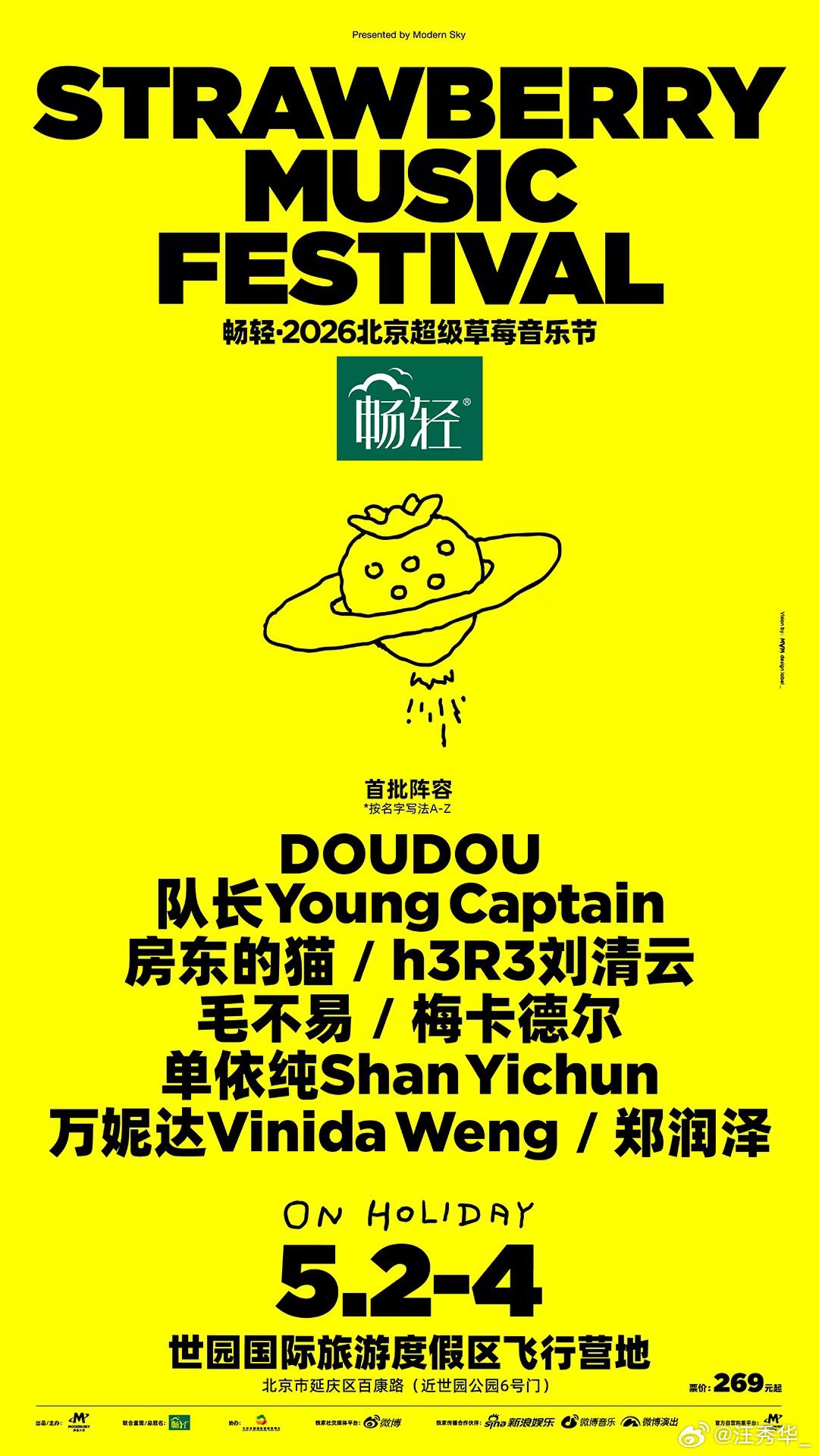 北京草莓音乐节首批阵容 谁懂啊!北京草莓首批阵容也太会了,DOUDOU、队长Young Captain、房东的猫、h3R3刘清云、毛不易、梅卡德尔、单依纯ShanYichun、万妮达Vinida Weng、郑润泽,耳朵要享福了!