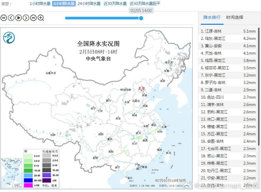 【雨雪】今天08-14时,吉林东部和黑龙江东部降雪明显,吉林江源5.1毫米,到15时今天降雪量已经有8毫米,大雪保底,奔着暴雪去了。另外广西、湖南、江西、安徽等地出现了弱降雨。今天下午到明天中午,冷暖气流重点的交汇区,在湖南湖北江西安徽江苏上海浙江。明天白天随着气温不断下降,安徽江苏浙江上海部分地区最快在明天午后,最迟明天夜间,可能出现雨转雪。