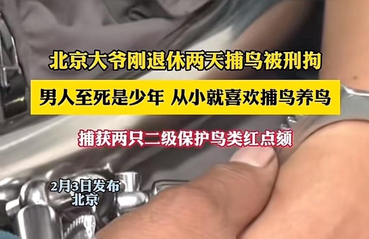 刚领到退休证才两天,一副手铐却先戴上了。 北京的张大爷怎么也没想到,自己规划的退休田园生活,竟会以这种方式开始。退休第二天,他在家附近的小树林里,用简易笼子捉了两只叫声清脆悦耳、羽毛带着漂亮红斑的小鸟——他童年记忆里的“红脖儿”。 这份重温旧梦的喜悦没持续多久,警察就上了门。他因涉嫌 “非法猎捕珍贵、濒危野生动物罪” 被刑事拘留。听到这个罪名,张大爷彻底懵了,老泪纵横:“我就是喜欢听它叫,养着玩,又不吃、不卖,咋就犯法了?我真不知道这鸟现在不能碰啊!” 他捉的鸟叫“红点颏”,是国家重点保护的野生动物。 在许多老北京人的童年记忆里,养鸟听叫是再平常不过的乐趣。但对张大爷这一代人来说,他们可能不知道,时代已经变了。随着生态保护意识的增强和法律体系的完善,许多过去的常见行为,如今已划入了法律禁区。 法律上有句严肃的话:“不知法者,不免责。” 这意味着,对法律的无知通常不能成为免除处罚的理由。根据我国《刑法》,非法猎捕国家重点保护的野生动物,情节轻微的也可能面临刑事处罚。法律的红线立在那里,不会因为当事人“不知道”而消失。 这件事在网上引发了巨大争议。很多网友觉得大爷冤枉:“纯粹是怀旧,又不是为了赚钱,教育一下放了吧!” 但也有很多声音认为,保护濒危物种刻不容缓,“如果今天因为不知情就放过,明天就有人假装不知道去破坏生态”。 张大爷的遭遇,像一面镜子,照出了两个时代的碰撞:一边是刻在骨子里的传统生活记忆,另一边是日益完善的现代法律与生态保护观念。它向我们抛出了一个沉重的问题:当“老传统”遇上“新法律”,我们该如何避免这样的悲剧? 真正的答案或许在于,普法宣传需要更细致、更提前。社会在鼓励老年人“老有所乐”的同时,也需要及时告诉他们,哪些“乐子”的边界已经改变。社区、公园是否可以多做一些常见保护动植物的科普?子女是否可以多给父母提个醒?让法律成为事前指引的路标,而非事后惩罚的铡刀。 对于真正爱鸟的人们来说,观鸟、拍鸟、成为保护志愿者,都是更值得提倡的、与时代同行的新方式。毕竟,真正的喜爱,是让鸟儿在天空自由地鸣叫,而不是在笼中为我们独唱。 这件事,您怎么看?是法不容情,还是情有可原?欢迎在评论区聊聊您的看法。 (本文依据《中华人民共和国刑法》、《中华人民共和国野生动物保护法》及相关司法实践进行解读,旨在提供普法信息,促进公众生态保护意识。)