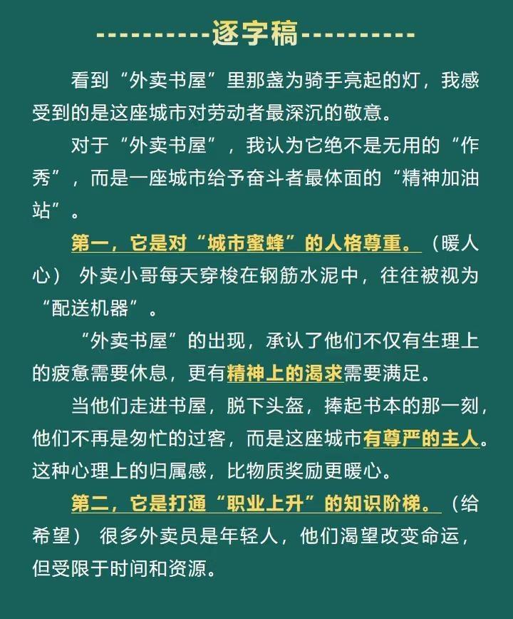 面试热点:“外卖书屋” 近期,一些城市专门为外卖骑手开设了“外卖书屋”,让他们在奔波之余有书读、有地歇。有人点赞这是“城市的暖灯”,也有人质疑骑手忙着赚钱哪有空看书,是“作秀”。对此,你怎么看? 事业单位面试 公考面试热点 结构化面试 公务员面试 社会热点 时事热点 申论热点 结构化 热点 面试