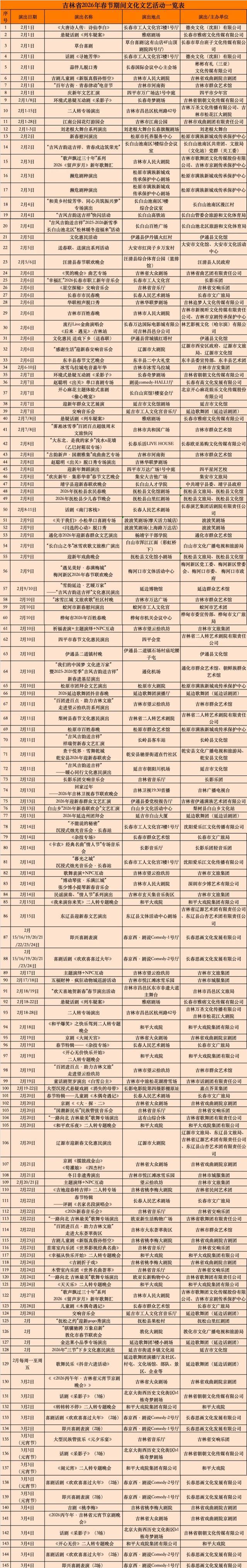 2026年吉林省春节期间文艺活动将以丰富内容、多元形式传递新春祝福,展现地域文化特色,陪伴全省群众和来吉游客度过欢乐祥和的新春佳节。