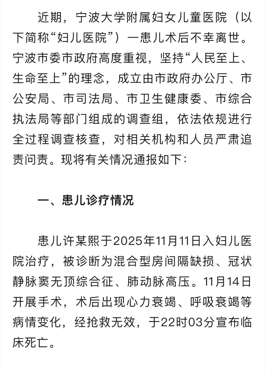 关于宁波患儿术后离世医疗事件调查处置情况的通报 现将有关情况通报如下: