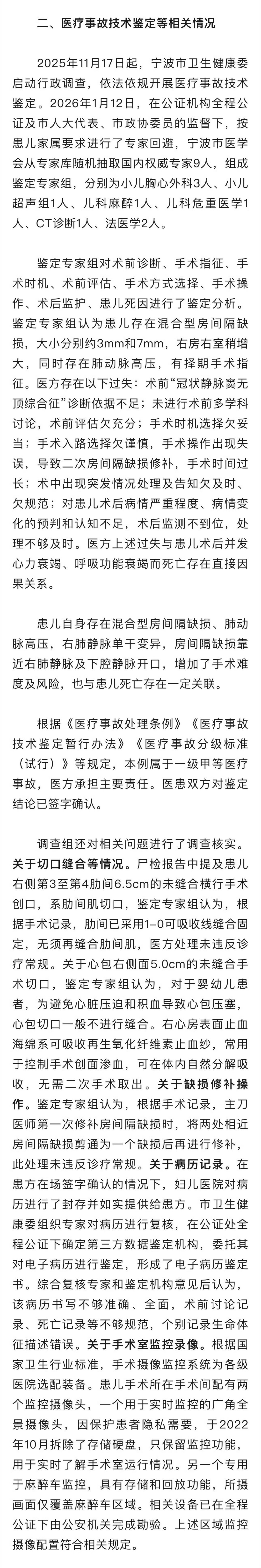 关于宁波患儿术后离世医疗事件调查处置情况的通报