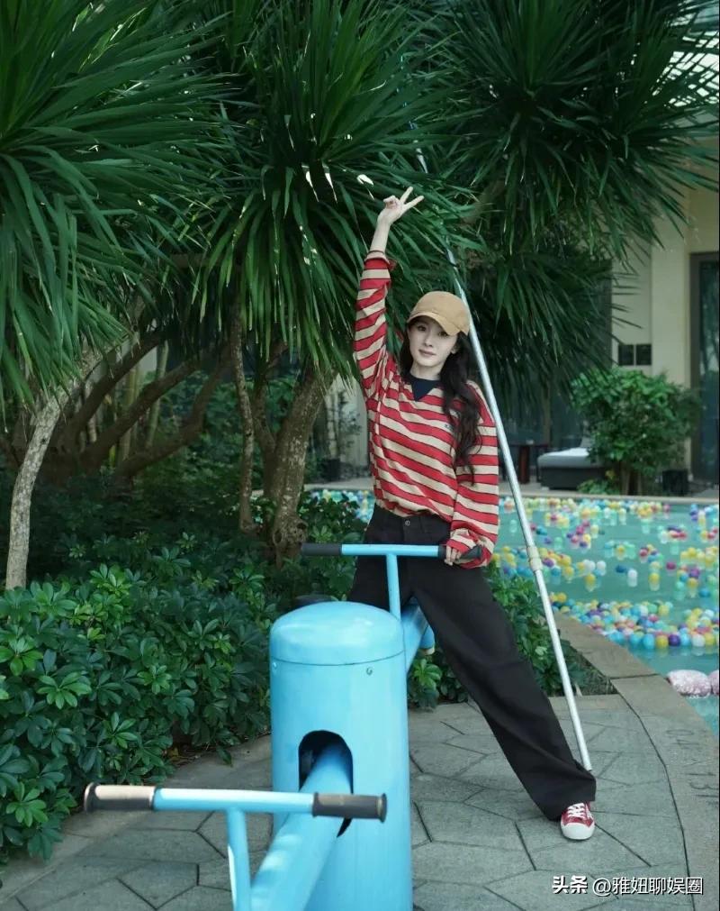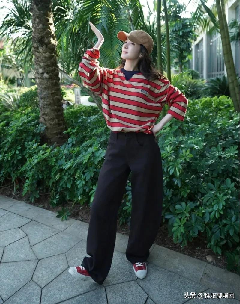 杨幂更新一组私服,这套红色条纹纯棉t恤长袖与黑色休闲长裤,穿出了青春活力时髦感。当然她颜值高,穿什么都很好看。个人非常喜欢她。