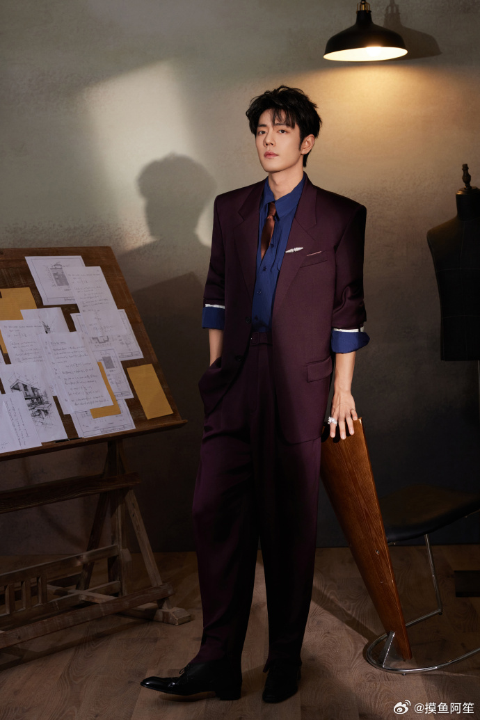 肖战 微博之夜出发图,帅哥今天是暗红色西装搭配藏蓝色内搭,这不就是藏海的官服配色吗?红到发紫,好帅! 肖战蓝衬衫紫色西装造型介