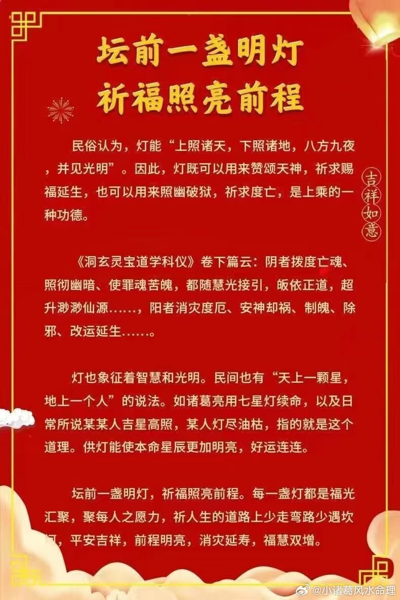 【供灯的好处】供灯是民间的一种祈福方式,通过点灯求神明赐予吉祥、顺遂、安泰、美满、财富,使供灯福主通向智慧、光明、财富的彼岸,使福主前程明亮,消灾延寿,姻缘美满,事业增长。