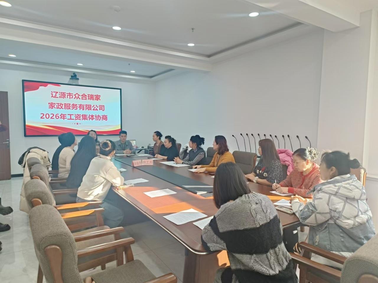2月3日上午9时,在吉林省辽源市总工会的协调与见证下,辽源市众合瑞家家政有限公司企业代表与来自保洁、月嫂、育婴师、产康师等岗位的职工代表展开工资集体协商会议,最终就多项关键权益达成一致,成功签订工资集体合同。