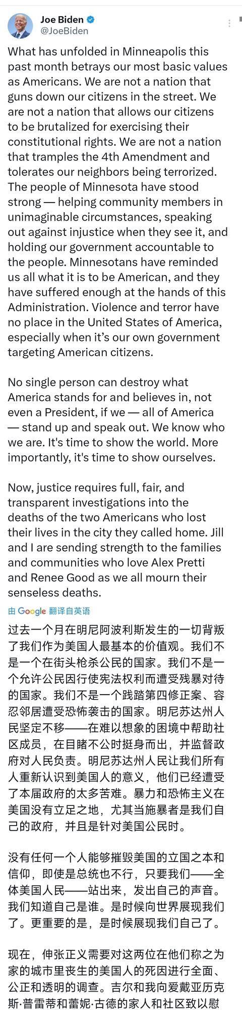 这回是真的变天了!隐身许久的前总统拜登突然 “杀了个回马枪”,直接把矛头对准了特朗普。字字诛心,直斥相关行径违背美国主流价值,加剧社会对立与撕裂! 拜登2026年1月27日声明针对明尼苏达两起联邦移民枪击案,指责政府背离基本价值观。强调美国不容街头射杀公民,不容公民因行使权利遭虐待,不容忽视第四修正案保障,不容居民恐惧生活。赞扬明尼苏达民众韧性,互相支持反对不公,要求政府负责。指出单一领导人无法破坏信念,除非民众沉默,呼吁表达意见维护身份。 第一起事件1月7日,蕾恩·妮科尔·古德37岁,三孩母亲,作为观察者在现场。移民海关执法局称她开车撞击,但视频显示车辆低速,特工近距离开火。古德社区志愿者,常助本地活动,那天路过查看。视频传播引发公众质疑官方,视过度使用力量。组织请愿求独立调查,民主党议员呼吁听证。 第二起1月24日,亚历克斯·普雷蒂急诊护士,手持手机录制。他持枪许可,但视频无取枪举动。特工击倒后补射,此行为限作战情境。普雷蒂热心公益,助移民医疗,拍摄查程序。联邦移除物品阻州调查。州检察长诉讼国土安全部违宪,求停行动。 州长蒂姆·沃尔兹部署国民警卫队,反驳联邦说法。起诉国土安全部罕见,标志体系断裂。强调特工蒙面随意武器超出执法。社区零下30度聚集要求问责,商户罢工。抗议用哨子警报,教堂提供庇护。NBA推迟赛事避冲突。 拜登逻辑连事件到宪政危机。若政府随意处决,权利空谈,国家本质变。未点名特朗普,但暗示当局负责。声明前媒体报不满积累。国土安全部长辩护行动针对犯罪移民,批评者指受害者公民无记录。国会调查民主党求视频文件,支持恐怖分子标签证据。抗议扩其他城市,州起诉讼指联邦干预。明尼阿波利斯警方报联邦干扰执法,资源紧张延犯罪响应。 1月25日,巴拉克·奥巴马和米歇尔·奥巴马声明称普雷蒂死为心碎悲剧,视对全国警醒,强调价值受攻击。批评联邦恐吓战术致两公民丧生,要求问责。比尔·克林顿社交称明尼阿波利斯场景可怕,从未想在美国发生,指责当局谎言阻调查,推动对抗策略。 特朗普政府1月27日晚宣布降执法强度,撤700特工,但发言人强硬称抗议暴徒,暗示用反叛乱法。部长克里斯蒂·诺姆辩护称基于情报,受害者视为威胁证据不足。提到行动移除670000非法移民,强调安全优先。 明尼阿波利斯混乱,5万人示威商户停业,运转瘫痪。寒冷中集会者分享故事,连2020弗洛伊德案,但此次施暴联邦部队挑战权威。社会分裂民调46%支持解移民局,半数赞特朗普措施。冲突一方秩序一方自由。事件动摇基础,联邦随意开枪州防范中央预示危机。 拜登声明缅怀旧信念,明尼苏达血迹象征权利消逝。若白宫行动持续,明尼苏达局面或全国扩散。
