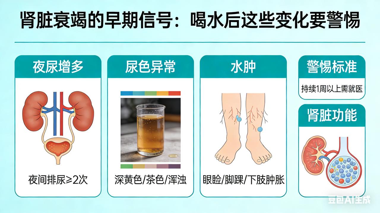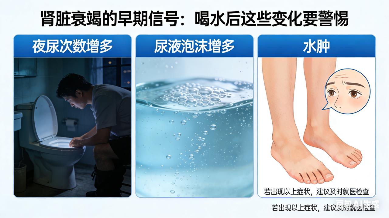 肾脏衰竭的早期信号:喝水后这些变化要警惕 惊!肾脏开始衰竭的第一信号,喝水后竟能察觉?太多人已中招却浑然不知! 肾脏,宛如人体中一座精密且不知疲倦的“净化城堡”,日夜不停地为我们过滤血液、排出毒素、调节水电解质平衡,是保障身体健康的幕后英雄。然而,肾脏衰竭这个“隐形杀手”常常在悄无声息中逼近,早期症状十分隐匿,极易被我们忽视。但你知道吗?肾脏开始衰竭时,喝水后身体的一些特殊表现,其实就是它发出的“求救信号”,可惜很多人都没放心上! 正常情况下,当我们畅快地喝下一杯水后,肾脏会迅速启动它的“净化程序”,尿液生成和排出都会比较顺畅。可一旦肾脏开始衰竭,肾功能逐渐下降,喝水后就会出现一系列异常情况。 少尿或无尿就是常见信号之一。肾脏就像一个高效的“过滤器”,当它出现故障,无法正常过滤血液形成尿液时,废物和多余水分就会在体内肆意积聚,导致尿量明显减少。有些患者即便咕咚咕咚喝下大量水,尿量却少得可怜,同时还可能伴有下肢水肿。用手按压水肿部位的皮肤,会出现一个明显的凹陷,而且这个凹陷很久都不能恢复原状,这就是体内水分潴留的直观表现。 喝水后频繁起夜也不能忽视。肾脏具有浓缩尿液的功能,当这个功能受损,尿液就无法被有效浓缩,夜尿自然就会增多。很多人觉得夜尿多不过是年龄大了的正常现象,根本没往肾脏疾病上想。但实际上,如果夜间排尿次数超过 2 - 3 次,且尿量增多,那就很可能是肾脏在向我们发出警报了。 另外,喝水后尿液颜色、性状的改变也暗藏玄机。肾脏衰竭时,尿液可能变得浑浊不堪,上面还漂浮着一层久久不消散的泡沫,这很可能是蛋白质漏出导致的蛋白尿;尿液颜色也可能加深,变成浓茶色或者洗肉水样,这提示可能出现了血尿。 肾脏健康关乎我们的生命质量,一旦出现上述喝水后的异常表现,千万不要掉以轻心。应及时前往医院,进行尿常规、肾功能、肾脏超声等相关检查,争取早发现、早干预、早治疗。日常生活中,我们也要养成良好的习惯,多喝水、不憋尿、避免滥用药物,用心呵护我们的肾脏。