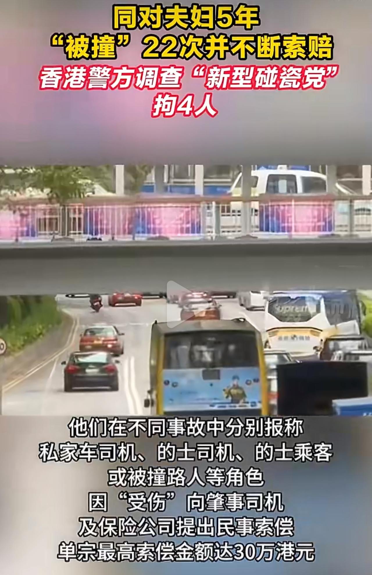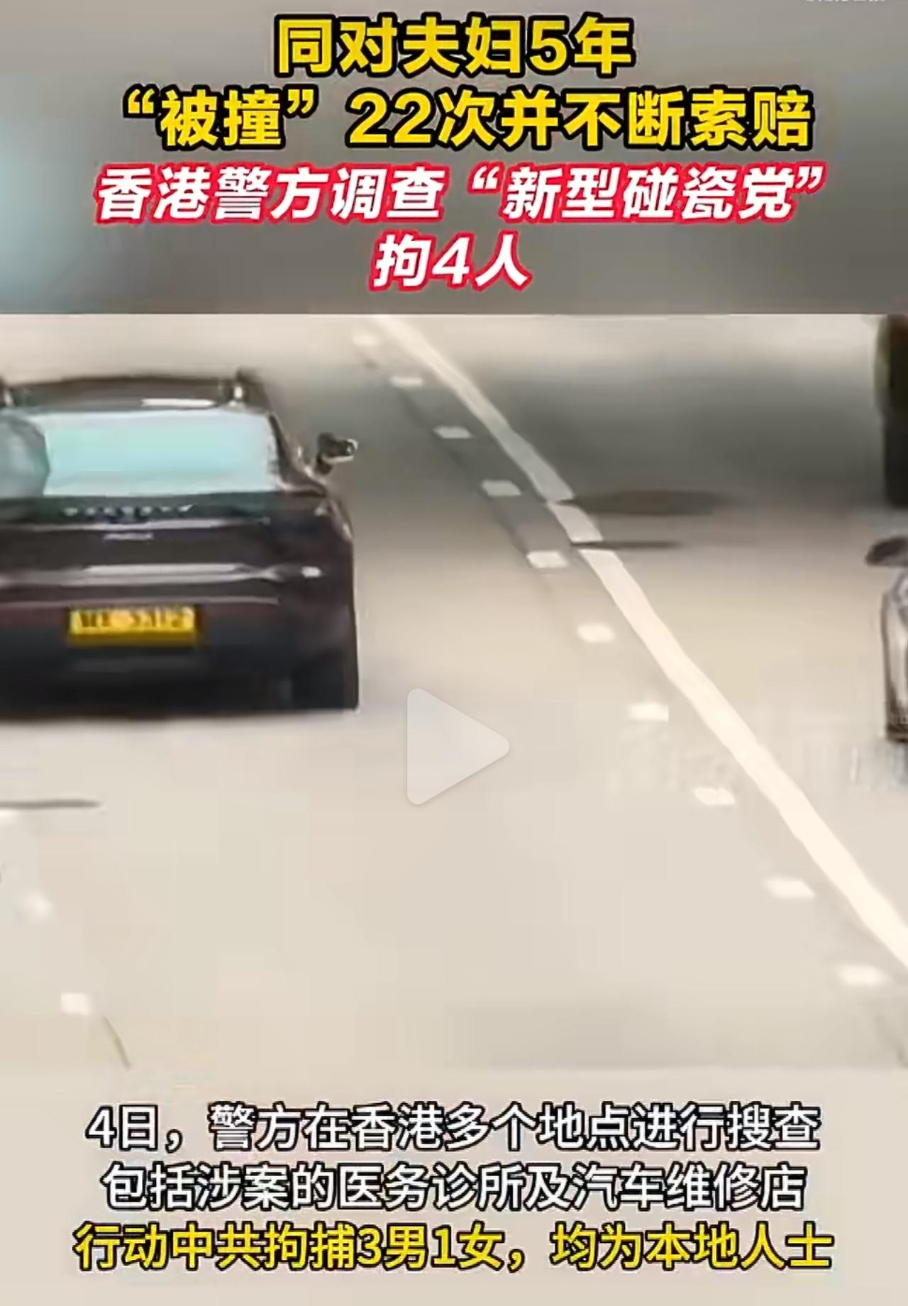 5年被车撞22次?香港这对夫妇的碰瓷套路,终于被警方一锅端了! 香港警方最近打掉一个新型碰瓷诈骗团伙,一对夫妻5年里靠“被撞伤”索赔22次,最高一次要了30万港元,还勾结医生、车房伪造证明,搞出了一整条黑色产业链。 他们先拍司机违章去举报,等对方交完罚款,就说自己在后面紧急刹车受了伤,以此讹钱。夫妻俩轮流扮司机、乘客、路人,医生开假伤情报告,车房开假维修单,骗来的钱换成了现金、名表和金器。 2月4号警方突击搜查,抓了3男1女,搜出一大堆伪造文件和赃物,还有100多起同类可疑案件等着查。这种诈骗涉嫌欺诈罪,最高能判14年监禁。 开车的朋友可得留心:出了事先报警、走保险流程,千万别私下和解;对方指定的诊所、律师,一定要多留个心眼;要是碰到同一个人反复索赔、伤情都差不多,十有八九是碰瓷。 行车记录仪前后双摄都开着,把证据留好,别让这些专业碰瓷的钻了空子。新型骗局碰瓷 碰瓷纠纷 “碰瓷”反被轧死,司机要赔偿吗?