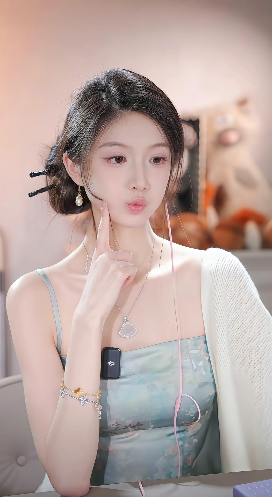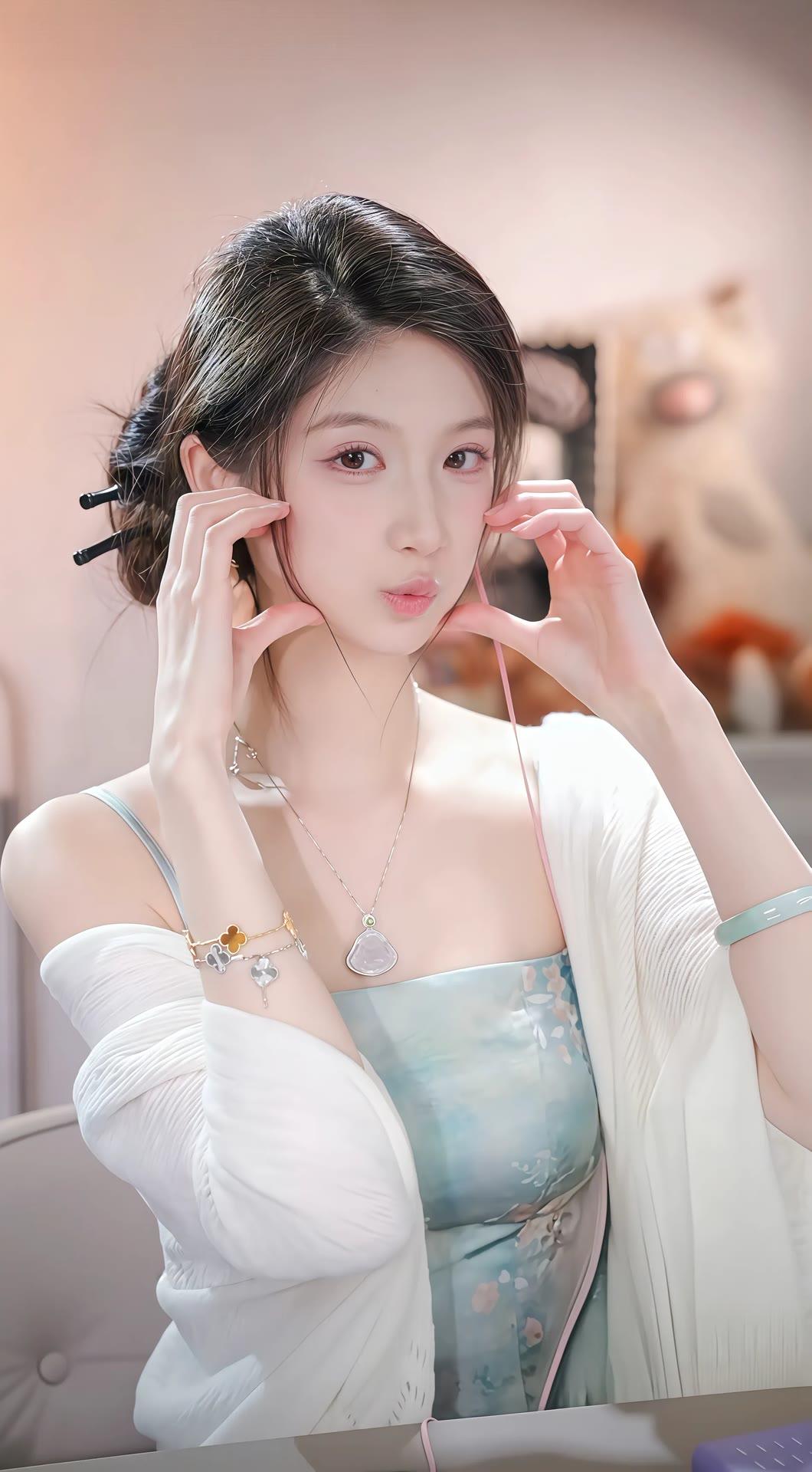 温柔甜美的少女,梦幻的蓝色连衣裙,精致的妆容,让人心动的微笑。