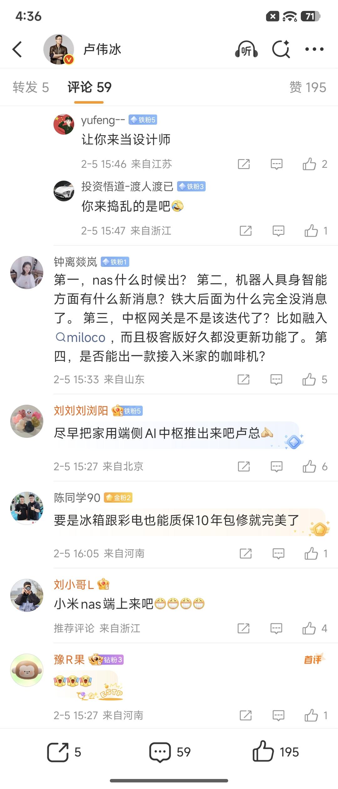 你们可真敢建议,卢总对小米25年大家电总结征求意见,竟然有人替把冰箱和电视也质保十年。我可从来没有在别家评论区看过这种要求,还是小米有魄力,空调十年质保,直接拉高了用户对行业的标准和要求,妥妥的吹号人。不过冰箱电视可不是空调,尤其是电视,十年寿命屏幕这一块就是很大考验,大家猜一猜,卢总会响应不?