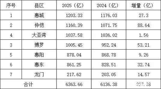 惠州各区县2025年GDP出炉:惠城仲恺差距缩小、博罗破千亿、龙门垫底 惠州是广东省经济第五强城市,2025年GDP实现6363.66亿,较2024年增加了227.28亿,截止目前,惠州各区县2025年GDP数据都已经出炉了,惠城区和仲恺区2025年GDP分别实现1203.33亿和1160.39亿,较2024年增加了27.3亿和88.64亿,仲恺区经济增量最高,不仅缩小了与惠城区的经济差距,还扩大了对大亚湾的经济领先优势。 博罗县2025年GDP总量成功突破一千亿大关,实现1005.45亿,较2024年增加了53.21亿,位居全市第四名。 龙门为全市GDP总量最低的区县,2025年GDP实现217亿,较2024年增加了14.57亿。