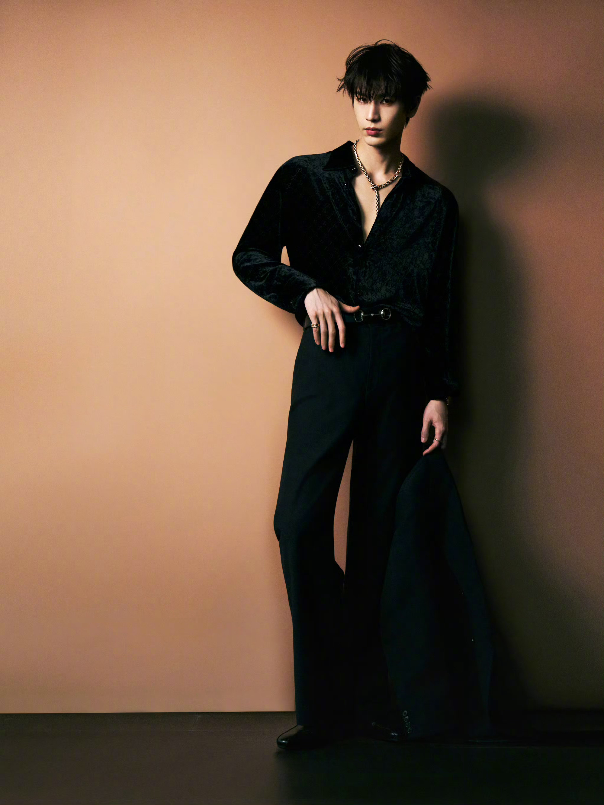 今日,出席微博之夜的张凌赫 |造型,身穿GUCCI黑色西服套装,内搭深V黑色绒翻