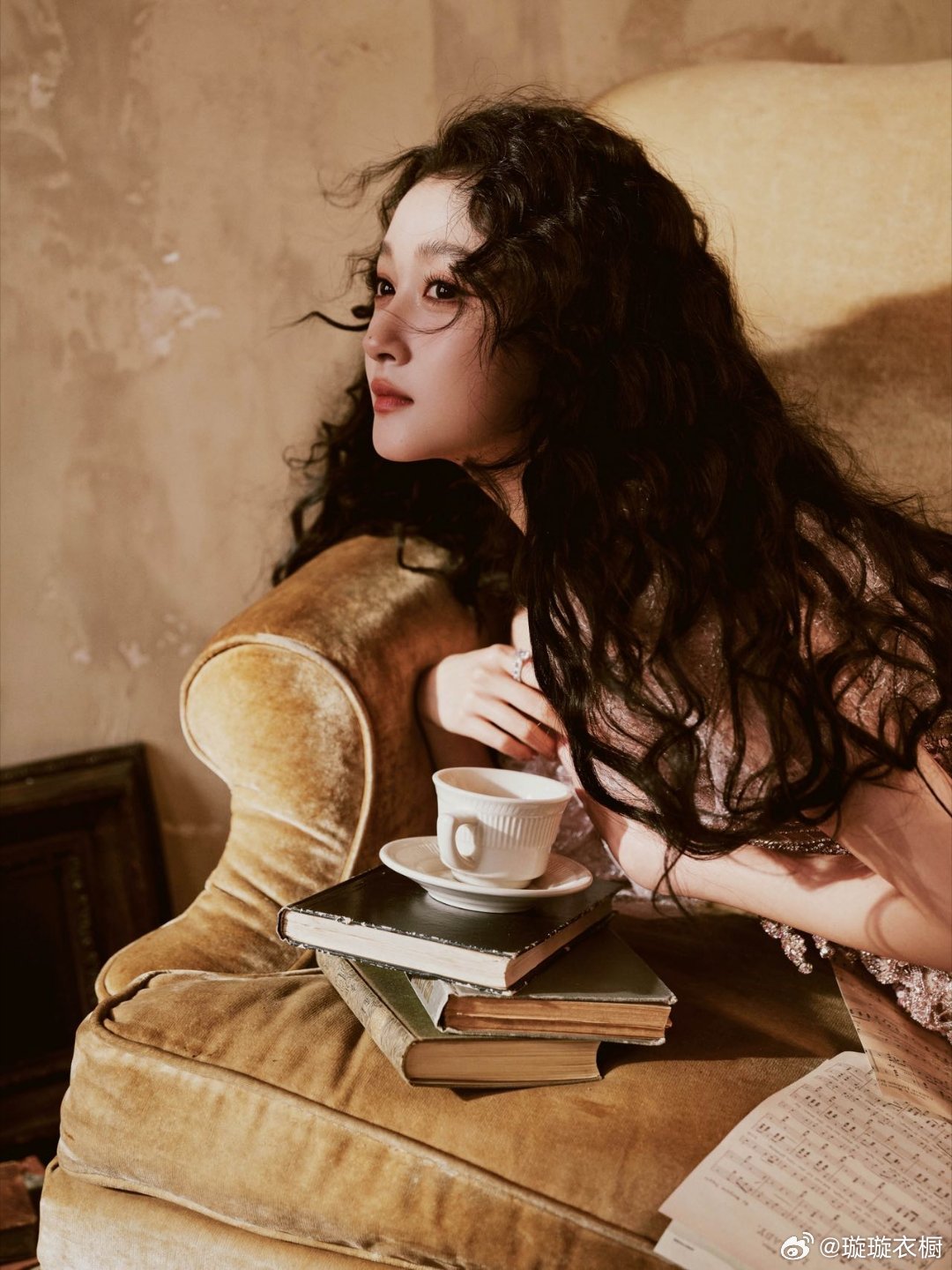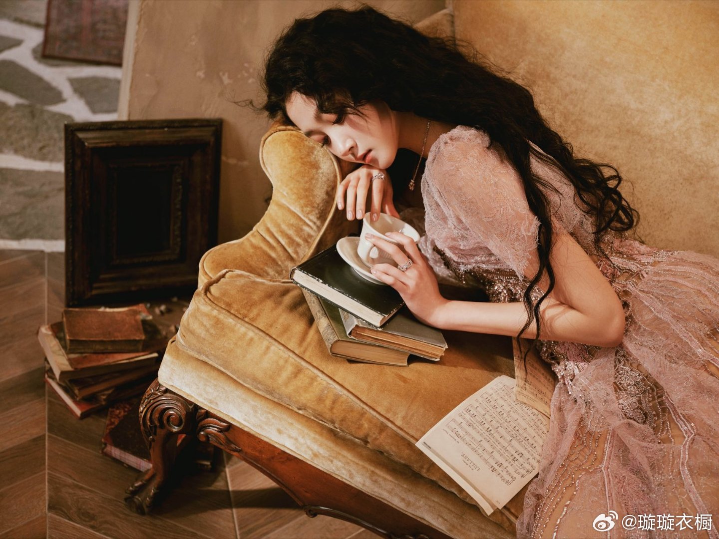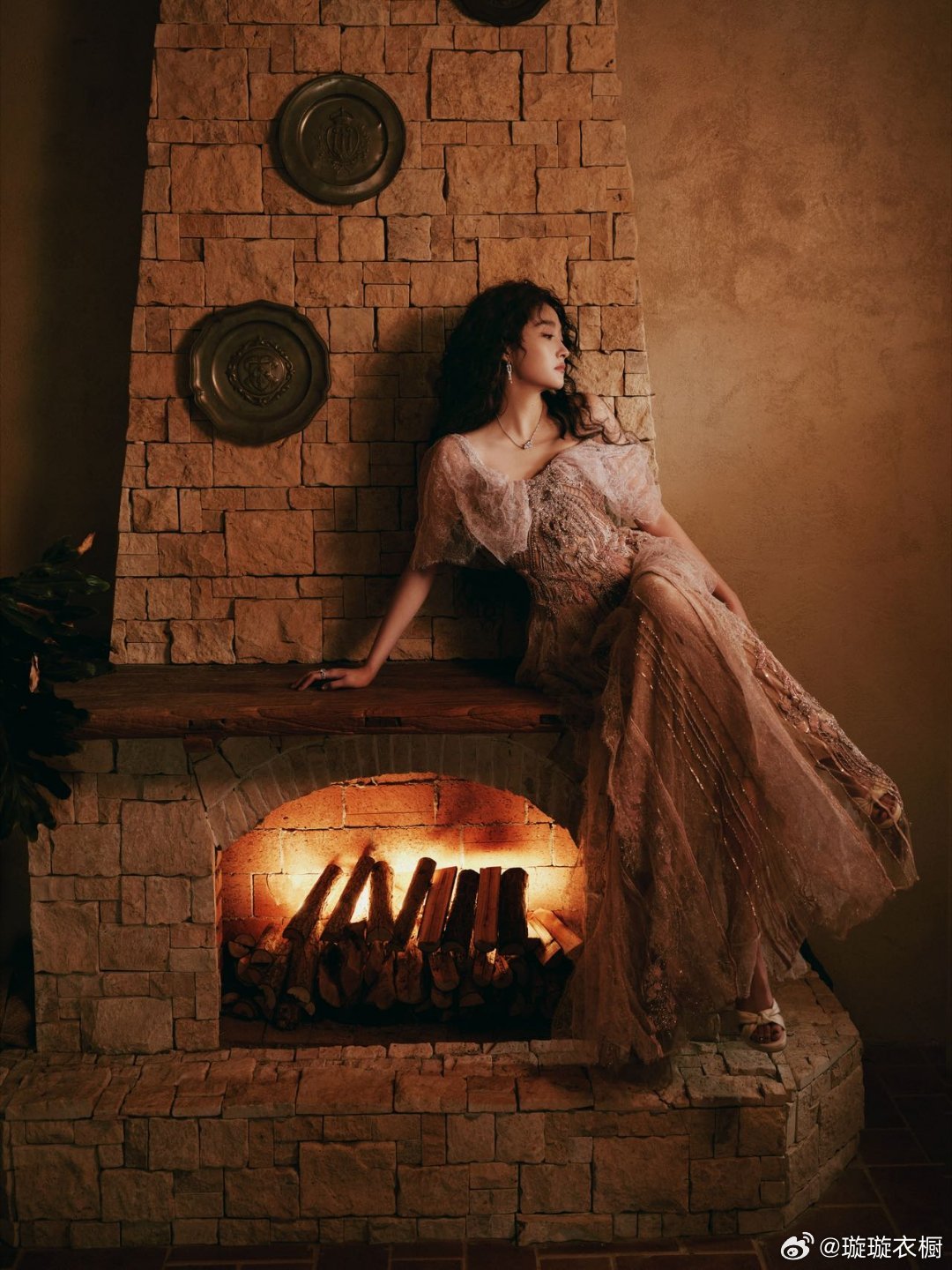 关晓彤蕾丝裙摆盛满月光,壁炉火光吻过她的发梢,慵懒与优雅在时光里共舞.咖啡香漫过
