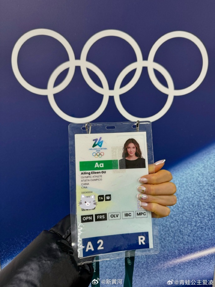 【#谷爱凌晒冬奥会参赛证#】#谷爱凌米兰冬奥会发文# 米兰冬奥会开幕在即,中国126名运动员出征米兰冬奥。5日,运动员谷爱凌@ 青蛙公主爱凌 发文:到达目的地 💙