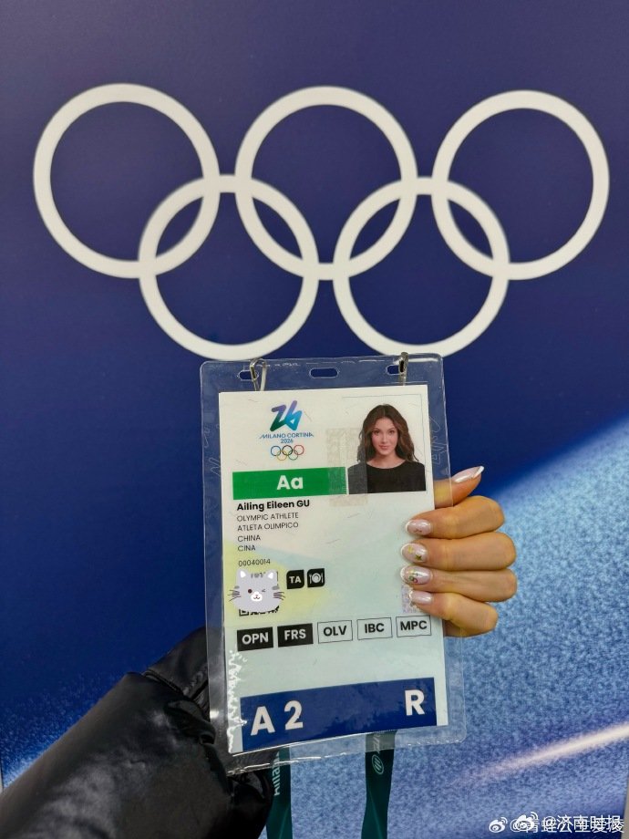 【#谷爱凌晒冬奥会参赛证#】#谷爱凌米兰冬奥会发文# 米兰冬奥会开幕在即,中国126名运动员出征米兰冬奥。5日,运动员谷爱凌@ 青蛙公主爱凌 发文:到达目的地 ?