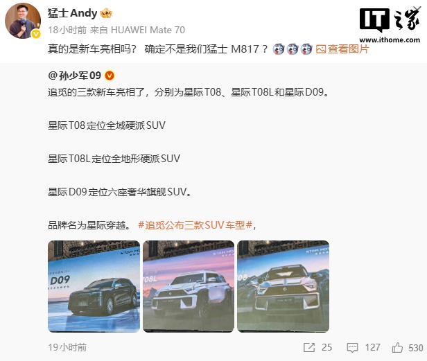 IT之家注意到,追觅昨日亮相了三款新车,分别命名为星际T08、星际T08L、星际D09。随后,@猛士Andy转发了相关博文并表示:“真的是新车亮相吗?确定不是我们猛士M817?”